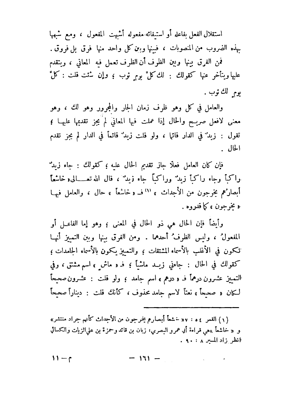 والمعتبر في مثل هذا حصول الفائدة، فإن نعت المنكور قرب من المعرفة بتخصيصه بالصفة، فحسن وقوع الحال منه شيئًا؛ كما جاء في الحديث «سبق الله صلى الله عليه وسلم، بين الخيل، فجاء فرس له سابقًا» (¬2) فقوله "سابقًا" حال من قوله "فرس"، وهو نكرة لكنه قد خصصه وصفه بقوله: "له" وهو الجار والمجرور، على أنه لو أجرى هذه الحال وصفًا، فقال: فرس له سابق لم يُعط المعنى الذي أعطته الحال، ولا تمحض له، ولجاز أن يفهم من الرفع أنه فرس سابق من قبل، وإن كانت الحال لا تمنع ذاك، ولكن ظاهر الأمر مع الرفع نعته بالسبق الذي يجوز أن يكون سبق له الوصف به لا الآن.