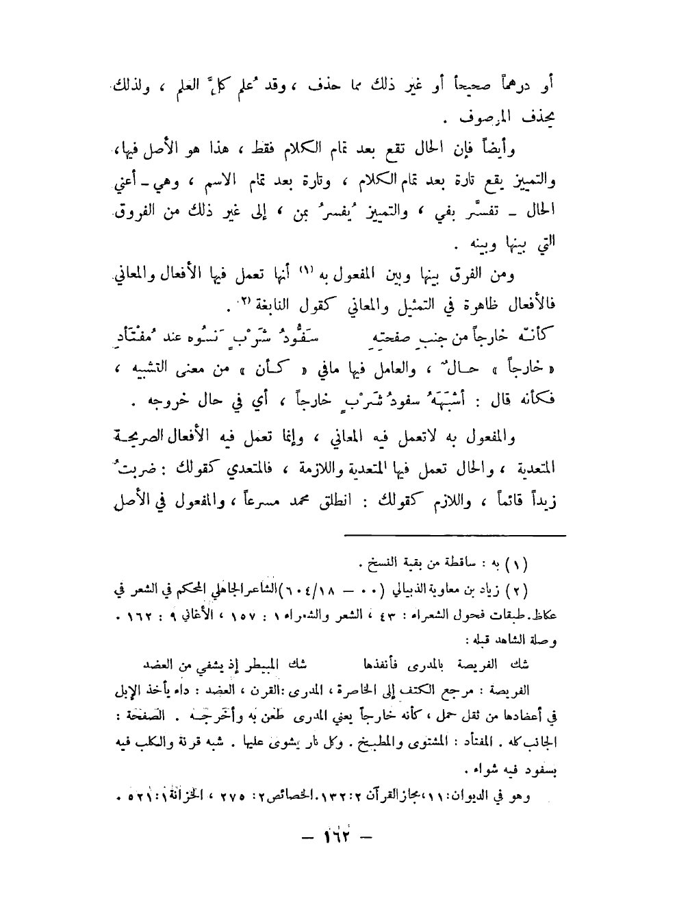 وعلة انتصاب هذه الحال عن النكرة المحضة التي لم تقرب من المعرفة بصفة ما، أن الوصف لا يتقدم على الموصوف؛ فإذا قدم ما يجوز أن يكون وصفًا للنكرة لو أخر بطل أن يكون وصفًا، فاذا بطل أن