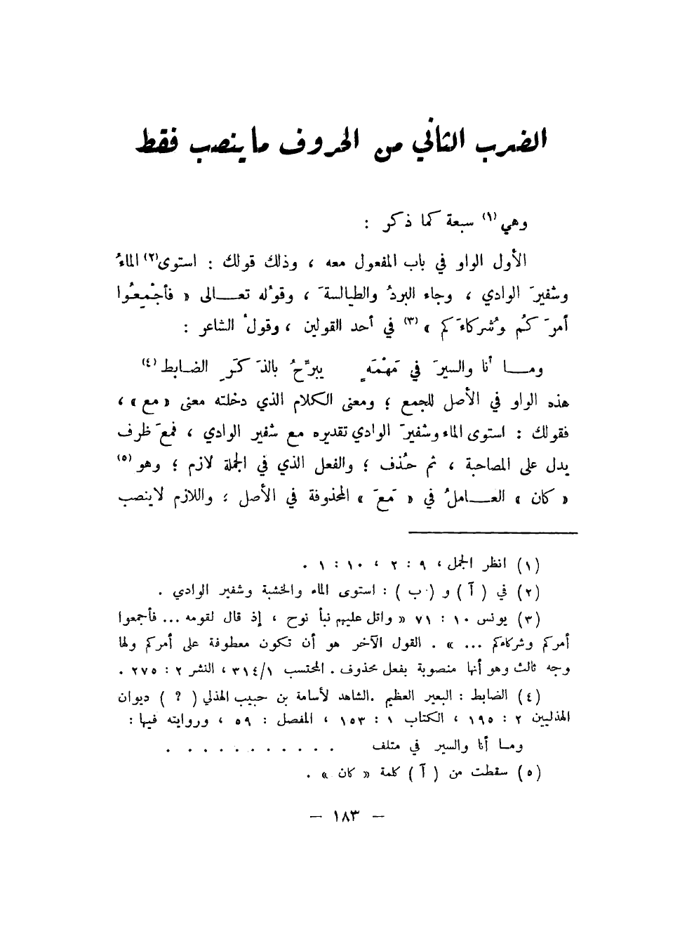 (¬1) للكوفيين ثلاثة آراء في "إلا"، فبعضهم يقول: إن العامل فيه "إلا" ويقول الفراء: "إلا" مركبة من "إن" و "لا"، ويقول الكسائي: تأويل "إلا"، إلا أن. انظر الإنصاف 4: 390.
