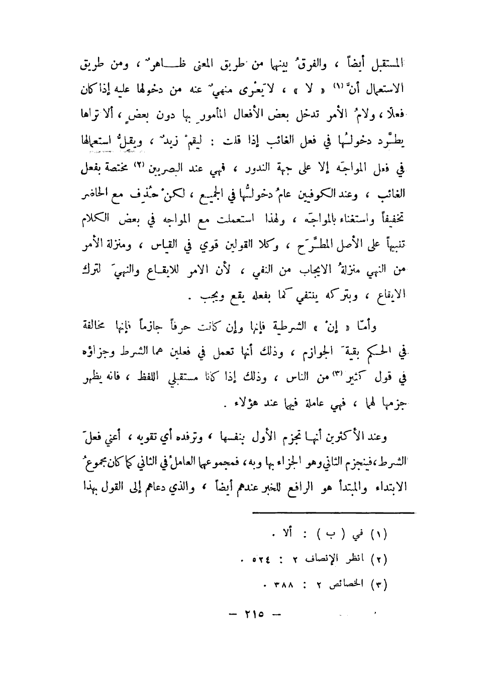 وعلى الجملة فالشرط وجوابه لا يخلوان من طريق الأفعال وقسمتها من أن يكونا فعلين مستقبلين؛ وذلك هو الأصل في الباب، لأن المعنى الذي وضع الشرط، عليه لا يكون إلا بالاستقبال، ولا يصح إلا به، وإذا كانا كذلك كانا مجزومي اللفظ، أو يكونا ماضيي اللفظ؛ فيحكم على معناهما بأنه مخالف للفظهما، وأنهما مستقبلان من طريق المعنى، ويُحكم على موضعهما بالجزم وأنهما متوسعٌ بإيقاعهما بلفظ المضي موضع المستقبل لغرضٍ صحيح ولفهم المعنى وعدم التباس الأفعال بعضها ببعض إذا قلت: إن قمت قمت، يدلك على أن المعنى إن تقم أقم، وأن الماضي هاهنا غير باقٍ على أصله، وأنه خارج (¬1) إلى معنى المستقبل بوقوعه موقعه أنك لو قرنت به زمناً ماضياً – أعني ظرفاً معناه المضي، وأعملته فيه – كان