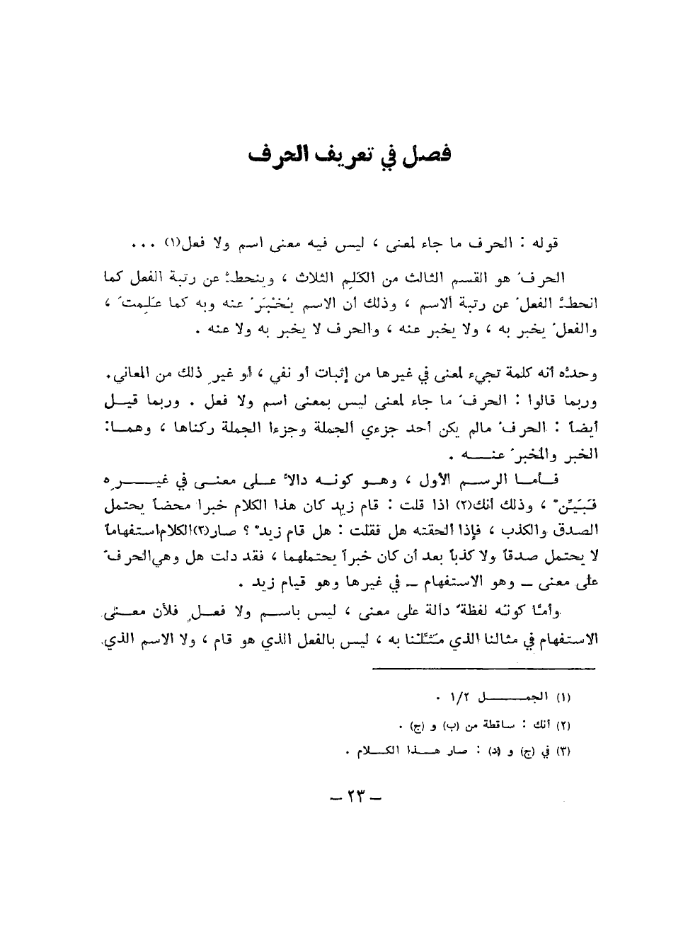 الحرف هو القسم الثالث من الكلم الثلاث، وينحط عن رتبة الفعل كما انحط الفعل عن رتبة الاسم، وذلك أن الاسم يخبر عنه وبه كما علمت، والفعل يخبر به، ولا يخبر عنه، والحرف لا يخبر به ولا عنه.