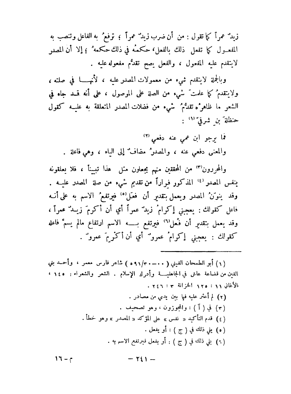 (¬4) الشاهد فيه نصب مسمع بالضرب وفيه الألف واللام وهو سائغ جائز. أولى المغيرة: أول الخيل تخرج للغارة والمراد فرسانها. النكول: النكوص والرجوع جبناً وخوفاً. مسمع هو مسمع بن شيبان (؟ ) أحد بني قيس بن ثعلبة. يقول: قد علم أول من لقيت من المغيرين أني صرفتهم عن وجوههم هازماً لهم ولحقت عميدهم فلم أنكل عن ضربه بسيفي.