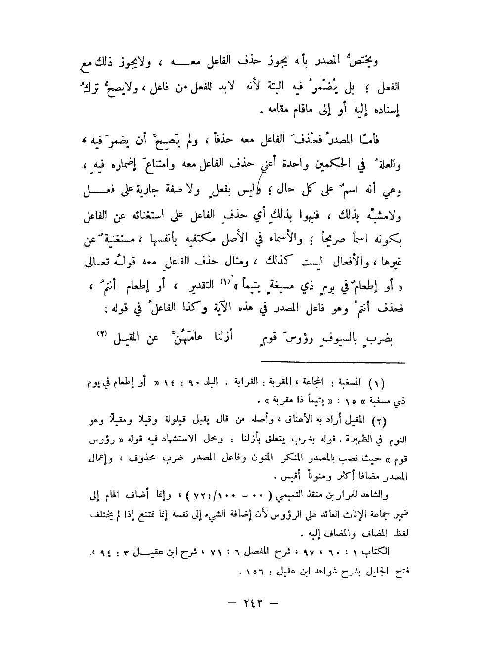 فأما التنزيل فلم يجيء في ظاهره شيء من هذا القسم، أعني إعمال المصدر معرفاً باللام، وأظنهم قد استنبطوا آية في القرآن حملوها على هذا القسم، والله أعلم بكتابه، وبالجملة، فهو معدوم في الفصيح من الكلام أو كالمعدوم، وعلة قلة هذا القسم في الاستعمال أنه يبعد من شبه الفعل في الحكم، إذ كان الفعل لا يتعرف البتة، وتقديره بأن والفعل - اللذين لا يعمل المصدر إلا بتقديرها مع الألف واللام فيه تعسف.