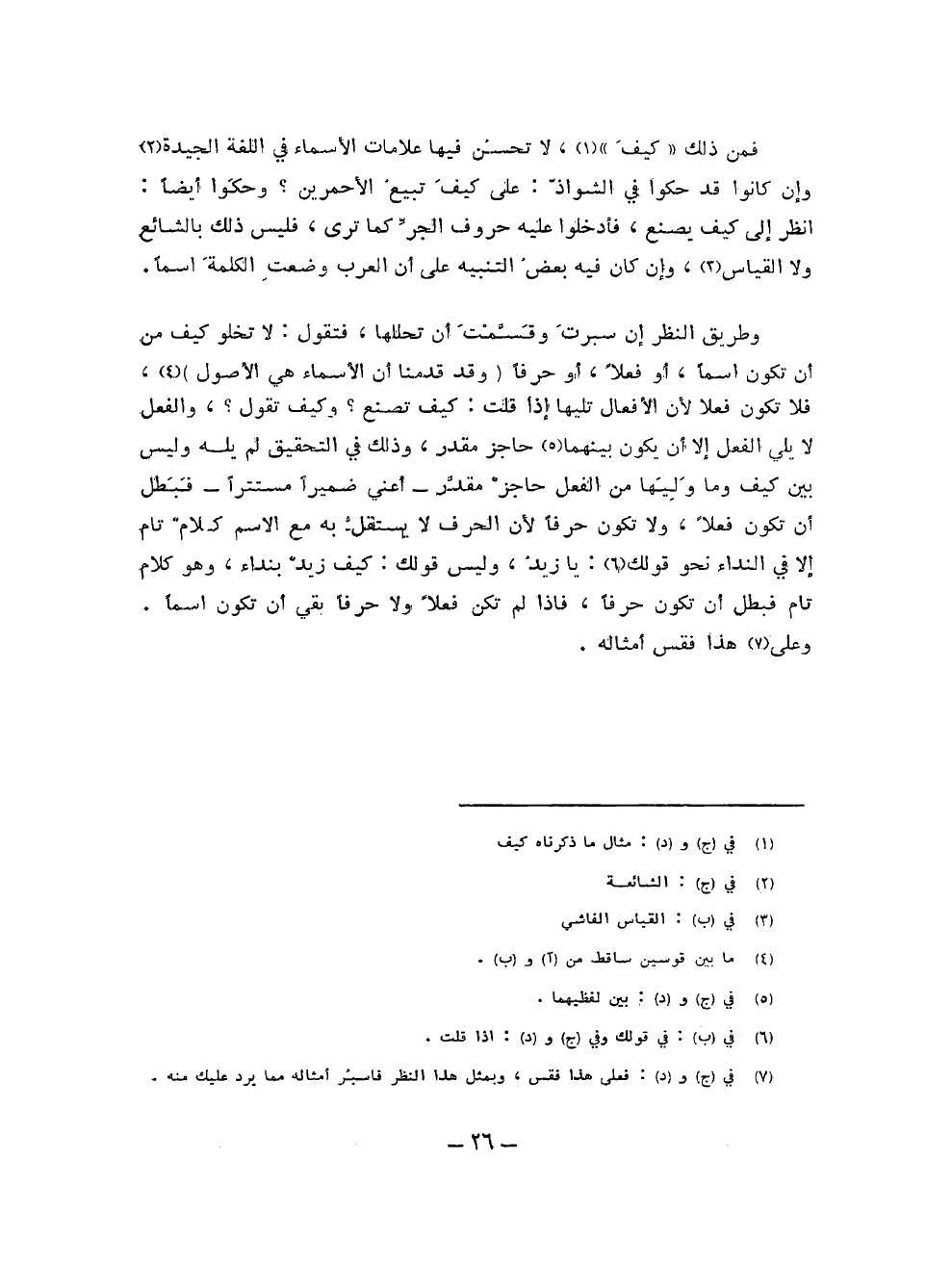 فمن ذلك "كيف" (¬1)، لا تحسن فيها علامات الأسماء في اللغة الجيدة (¬2) وإن كانوا قد حكوا في الشواذ: على كيف تبيع الأحمرين؟ وحكوا أيضاً: انظر إلى كيف يصنع، فأدخلوا عليه حروف الجر كما ترى، فليس ذلك بالشائع ولا القياس (¬3)، وإن كان فيه بعض التنبيه على أن العرب وضعت الكلمة اسماً.