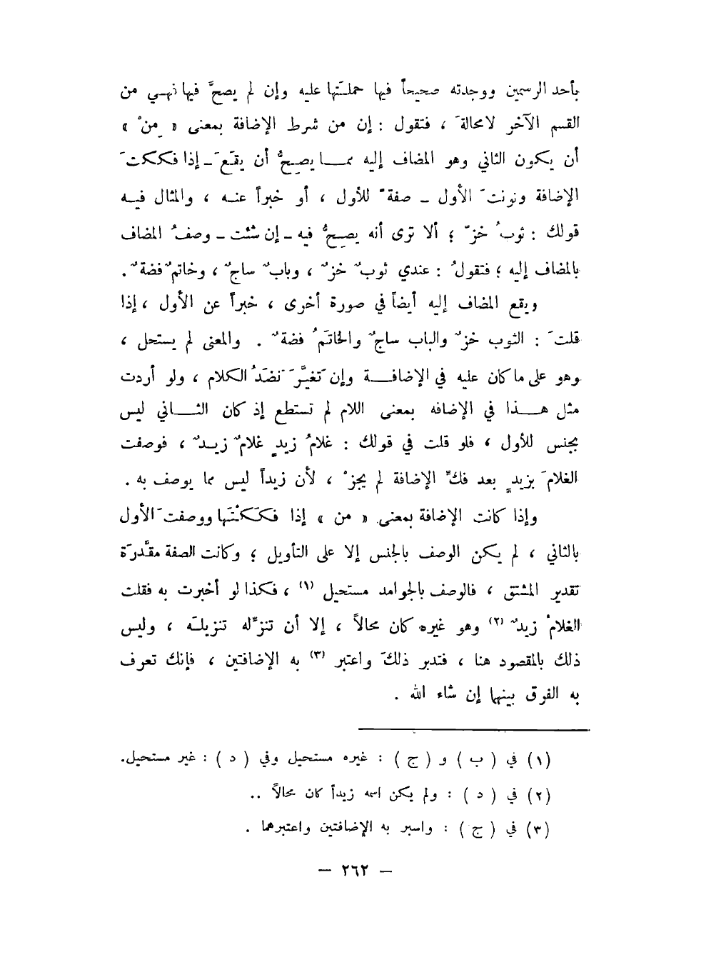 وإضافة المائة عند المدققين إضافةٌ بمعنى اللام، وإضافة ثلاثمائةٍ وما بعدها من العقود إلى تسعمائة إضافةٌ بمعنى "من"، وذلك أن المائة عدد عندهم كما تعلم، وما أضيفت إليه معدودٌ، والعدد ليس ببعضٍ للمعدود ولا هو منه، بل له فكانت إضافة مائةٍ ومائتين لذلك إضافةً بمعنى اللام، وثلاثٌ وأربعٌ من قولك: ثلاثمائة وأربعمائة عددٌ والمائة التي تقع الإضافة إليها عددٌ أيضاً، فهي إضافة عددٍ إلى عدد،