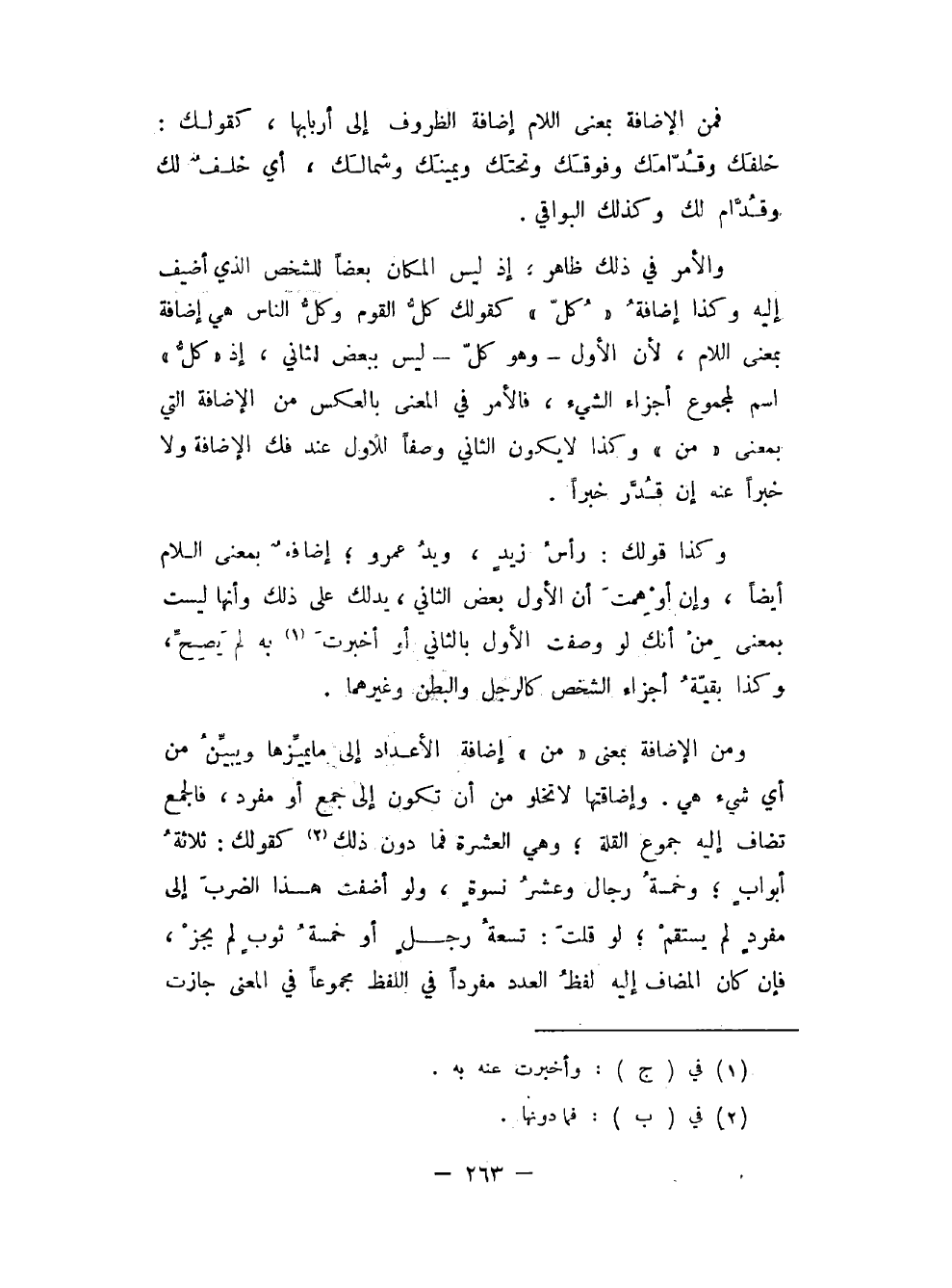 فعلى هذا ينبغي أن يكون في قولهم: ثلاثمائة درهم وبابه إضافتان الأولى بمعنى "من" والأخرى بمعنى اللام، وعلى هذا التعليل كلامٌ يدق عن هذا المختصر فلا نطيل به، بل قد نبهنا عليه.