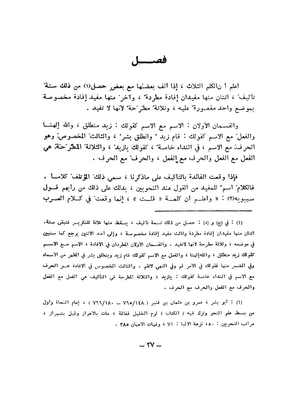 (¬1) " في (ج) و (د): حصل من ذلك تسعة تآليف، يسقط منها ثلاثة للتكرير فتبقى ستة. اثنان منها مفيدان إفادة مطردة وثالث مفيد مخصوصة، وإلى أحد الاثنين يرجع كما سنبين في موضعه، وثلاثة مطرحة لأنها لا تفيد. والقسمان الأولان المطردان في الإفادة، الاسم مع الاسم كقولك زيد منطلق، والله إلهنا، والفعل مع الاسم كقولك قام زيد وينطلق بشر في المظهر من الأسماء وفي المضمر منها كقولك في الأمر قم وفي النهي لا تقم. والثالث المخصوص في الإفادة هو الحرف مع الاسم في النداء خاصة كقولك: يا زيد، والثلاثة المطرحة في التأليف هي الفعل مع الفعل والحرف مع الفعل والحرف مع الحرف.