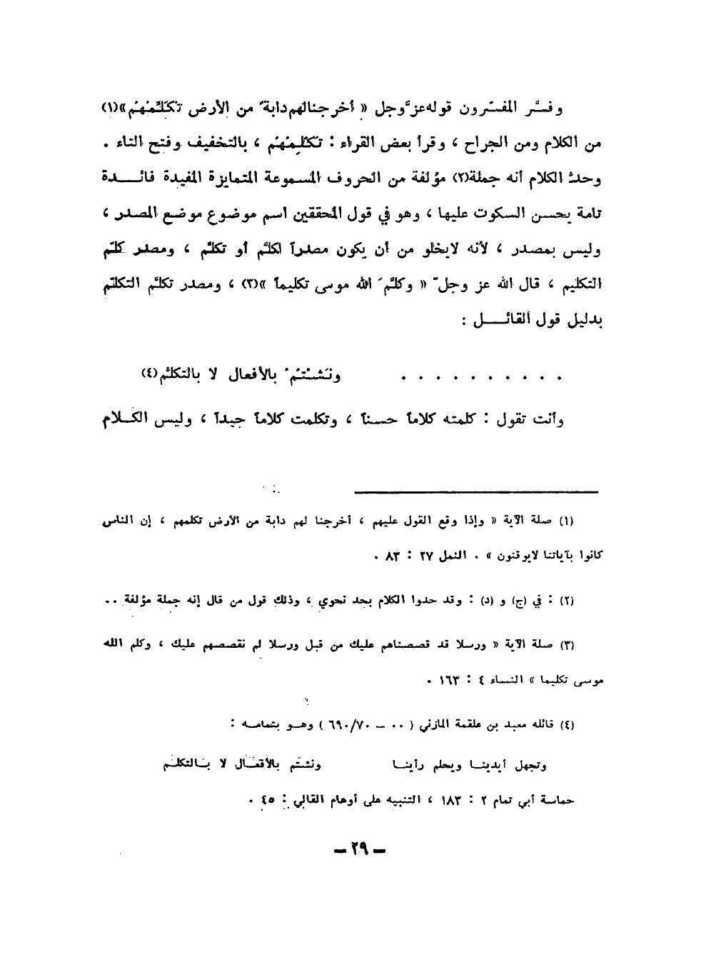 وفسر المفسرون قوله عز وجل {أَخْرَجْنَا لَهُمْ دَابَّةً مِنَ الأَرْضِ تُكَلِّمُهُمْ} (¬1) [النمل: 82] من الكلام ومن الجراح، وقرأ بعض القراء: تكلمهم، بالتخفيف وفتح التاء. وحدث الكلام أنه جملة (¬2) مؤلفة من الحروف المسموعة المتمايزة المفيدة فائدة تامة يحسن السكوت عليها، وهو في قول المحققين اسم موضوع موضع المصدر، وليس بمصدر، لأنه لا يخلو من أن يكون مصدراً لكلم أو تكلم، ومصدر كلم التكليم، قال الله عز وجل {وَكَلَّمَ اللَّهُ مُوسَى تَكْلِيمًا} (¬3) [النساء: 164]، ومصدر تكلم التكلم بدليل قول القائل: