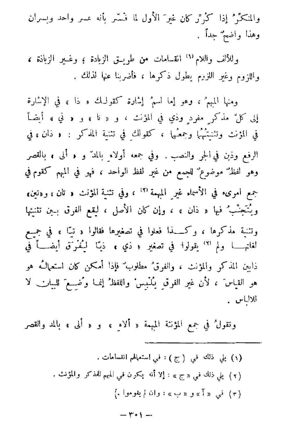 (¬3) في (ج): لطيفة في الفرق بين المضمرات وأسماء الإشارة مع اشتراكهما في التعريف والبناء وحاجتهما إلى البيان، وهي أن بيان المضمر بما قبله وبيان اسم الإشارة بما بعده. ألا ترى أنك تقول زيد مررت به، فمبين المضمر وهو الهاء في به مظهره وهو زيد، ويبين اسم الجنس الواقع بعده كالرجل والفرس وما أشبههما إذا قلت مررت بذاك الرجل وركبت تلك الفرس ولبست ذاك الثوب، فأعرفه.