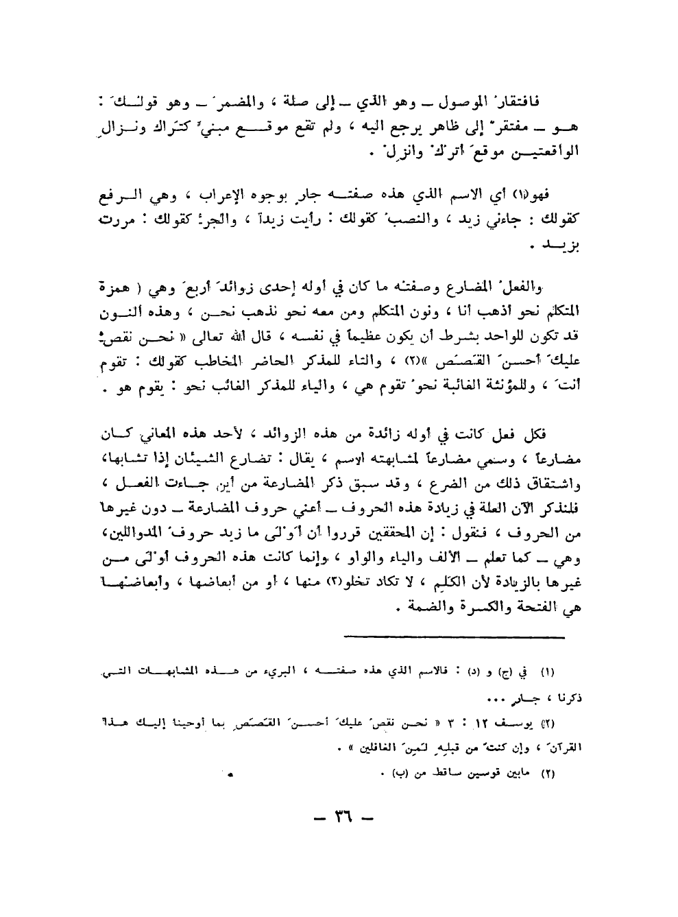 والفعل المضارع وصفته ما كان في أوله إحدى زوائد أربعَ وهي (همزة المتكلم نحو أذهب أنا، ونون المتكلم ومن معه نحو نذهب نحن، وهذه النون قد تكون للواحد بشرط أن يكون عظيماً في نفسه، قال الله تعالى {نَحْنُ نَقُصُّ عَلَيْكَ أَحْسَنَ الْقَصَصِ} (¬2) [يوسف: 3]، والتاء للمذكر الحاضر كقولك: تقوم أنتَ، وللمؤنثة الغائبة نحو تقوم هي، والياء للمذكر الغائب نحو: يقوم هو.