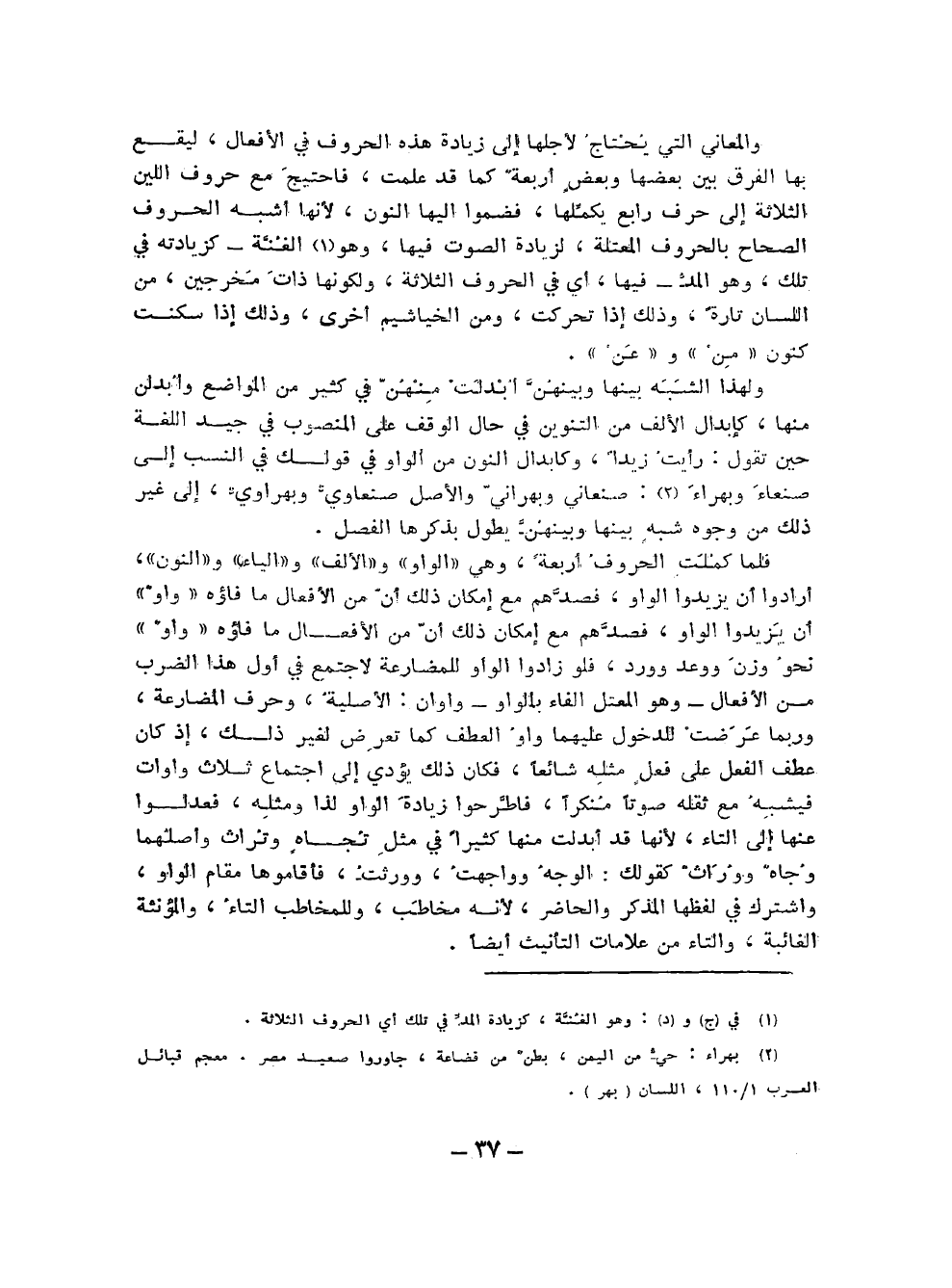 والمعاني التي يحتاج لأجلها إلى زيادة هذه الحروف في الأفعال، ليقع بها الفرق بين بعضها وبعض أربعة كما قد علمت، فاحتيج مع حروف اللين الثلاثة إلى حرف رابع يكملها، فضموا إليها النون، لأنها أشبه الحروف الصحاح بالحروف المعتلة، لزيادة الصوت فيها، وهو (¬1) الغنَّة - كزيادته في تلك، وهو المد ـ فيها، أي في الحروف الثلاثة، ولكونها ذاتَ مخرجين، من اللسان تارة، وذلك إذا تحركت، ومن الخياشيم أخرى، وذلك إذا سكنت كنون "مِنْ" و"عَن".