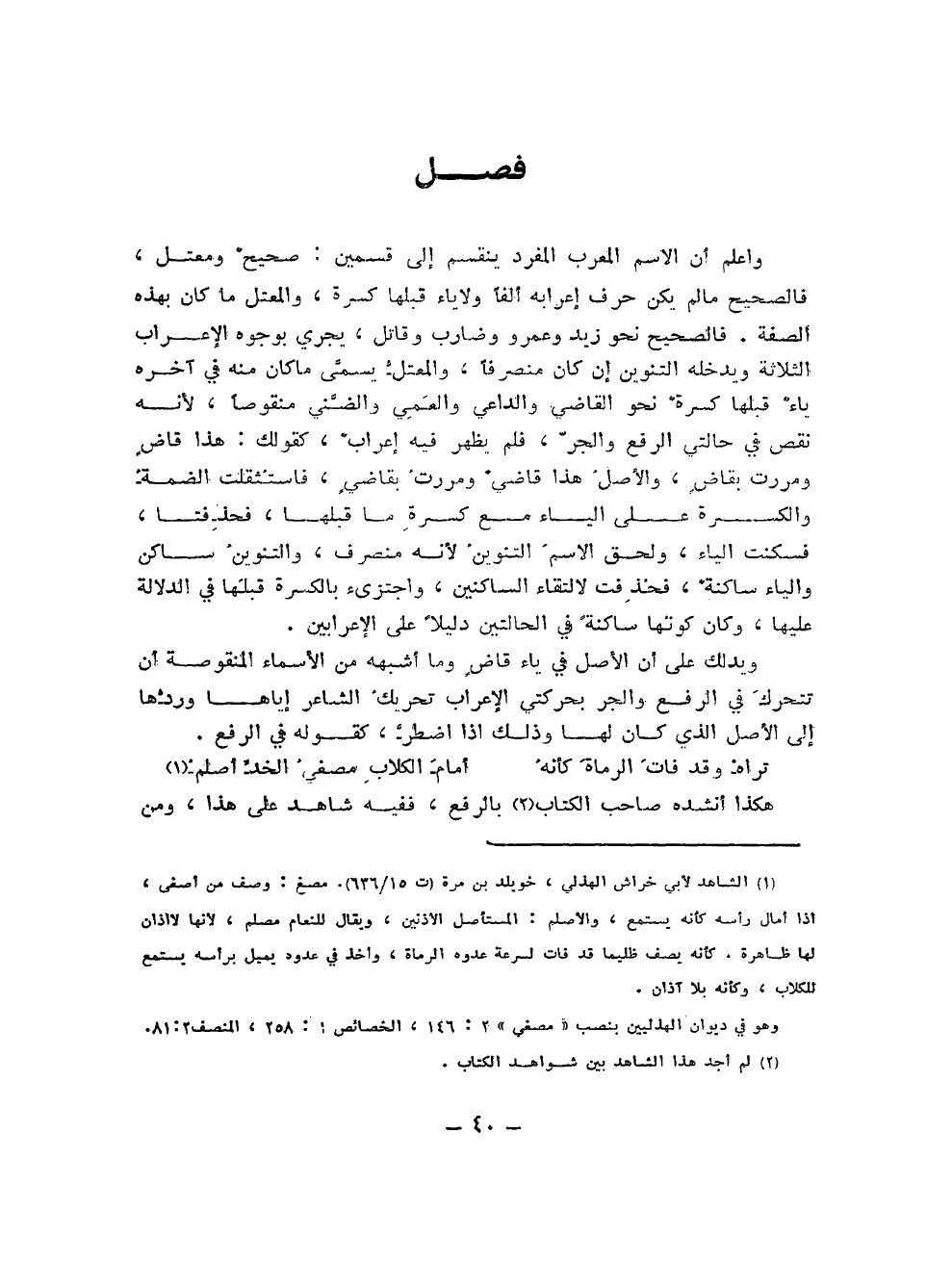 واعلم أن الاسم المعرب المفرد ينقسم إلى قسمين: صحيح ومعتل، فالصحيح ما لم يكن حرف إعرابه ألفاً ولا ياء قبلها كسرة، والمعتل ما كان بهذه الصفة. فالصحيح نحو زيد وعمرو وضارب وقاتل، يجري بوجوه الإعراب الثلاثة ويدخله التنوين إن كان منصرفاً، والمعتل يسمى ما كان منه في لآخره ياء قبلها كسرة نحو القاضي والداعي والعمي والضني منقوصاً، لأنه نقص في حالتي الرفع والجر، فلم يظهر فيه إعراب، كقولك: هذا قاض ومررت بقاض، والأصل هذا قاضي ومررت بقاضي، فاستثقلت الضمة والكسرة على الياء مع كسرة ما قبلها، فحذفتا، فسكنت الياء، ولحق الاسم التنوين لأنه منصرف، والتنوين ساكن والياء ساكن، فحذفت لالتقاء الساكنين، واجتزئ بالكسرة قبلها في الدلالة عليها، وكان كونها ساكنة في الحالتين دليلاً على الإعرابين.