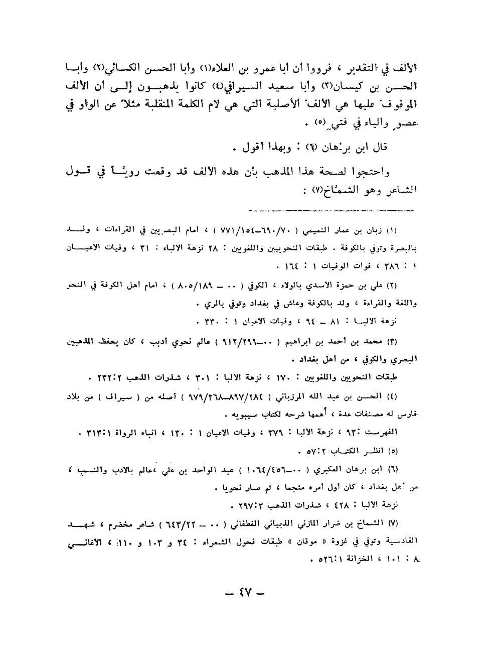 الألف في التقدير، فرووا أن أبا عمرو بن العلاء (¬1) وأبا الحسن الكسائي (¬2) وأبا الحسن بن كيسان (¬3) وأبا سعيد السيرافي (¬4) كانوا يذهبون إلى أن الألف الموقوف عليها هي الألف الأصلية التي هي لام الكلمة المنقلبة مثلاً عن الواو في عصو والياء في فتي (¬5).