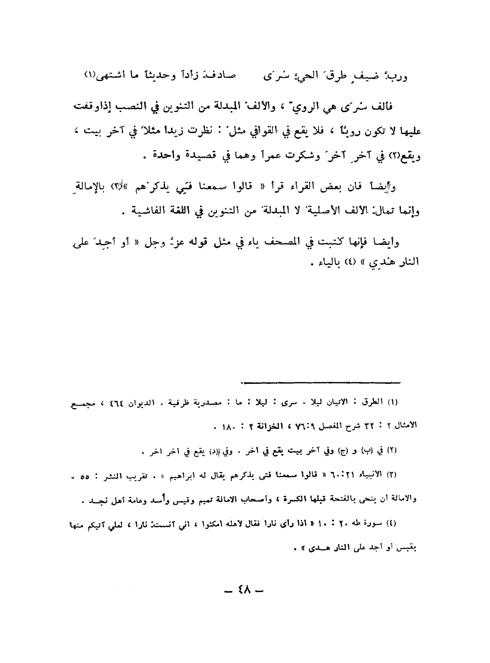 وأيضاً فإن بعض القراء قرأ "قالوا سمعنا فتى يذكرهم" (¬3) بالإمالة وإنما تمال: الألف الأصلية لا المبدلة من التنوين في اللغة الفاشية.
