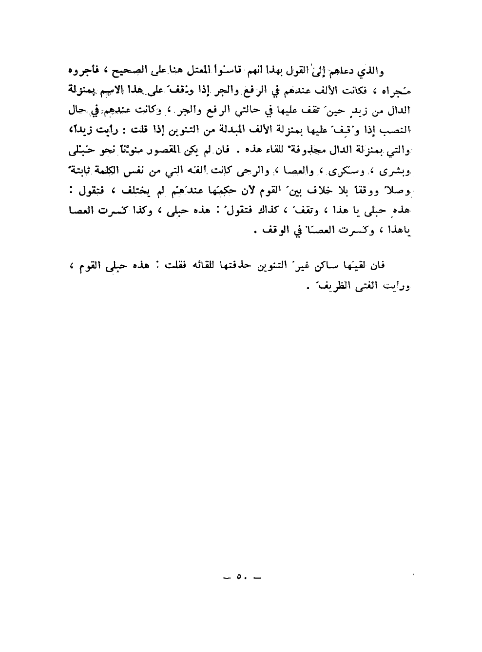 والذي دعاهم إلى القول بهذا أنهم قاسوا المعتل هنا على الصحيح، فأجروه مجراه، فكانت الألف عندهم في الرفع والجر إذا وقف على هذا الاسم بمنزلة الدال من زيد حين تقف عليها في حالتي الرفع والجر، وكانت عندهم في حال النصب إذا وقف عليها بمنزلة الألف المبدلة من التنوين إذا قلت: رأيت زيداً، والتي بمنزلة الدال محذوفة للقاء هذه. فإن لم يكن المقصور منوناً نحو حبلى وبشرى، وسكرى، والعصا، والرحى كانت ألفه التي من نفس الكلمة ثابتة وصلا ووقفاً بلا خلاف بين القوم لأن حكمها عندهم لم يختلف، فتقول: هذه حبلى يا هذا، وتقف، كذاك فتقول: هذه حبلى، وكذا كسرت العصا يا هذا، وكسرت العصا في الوقف.