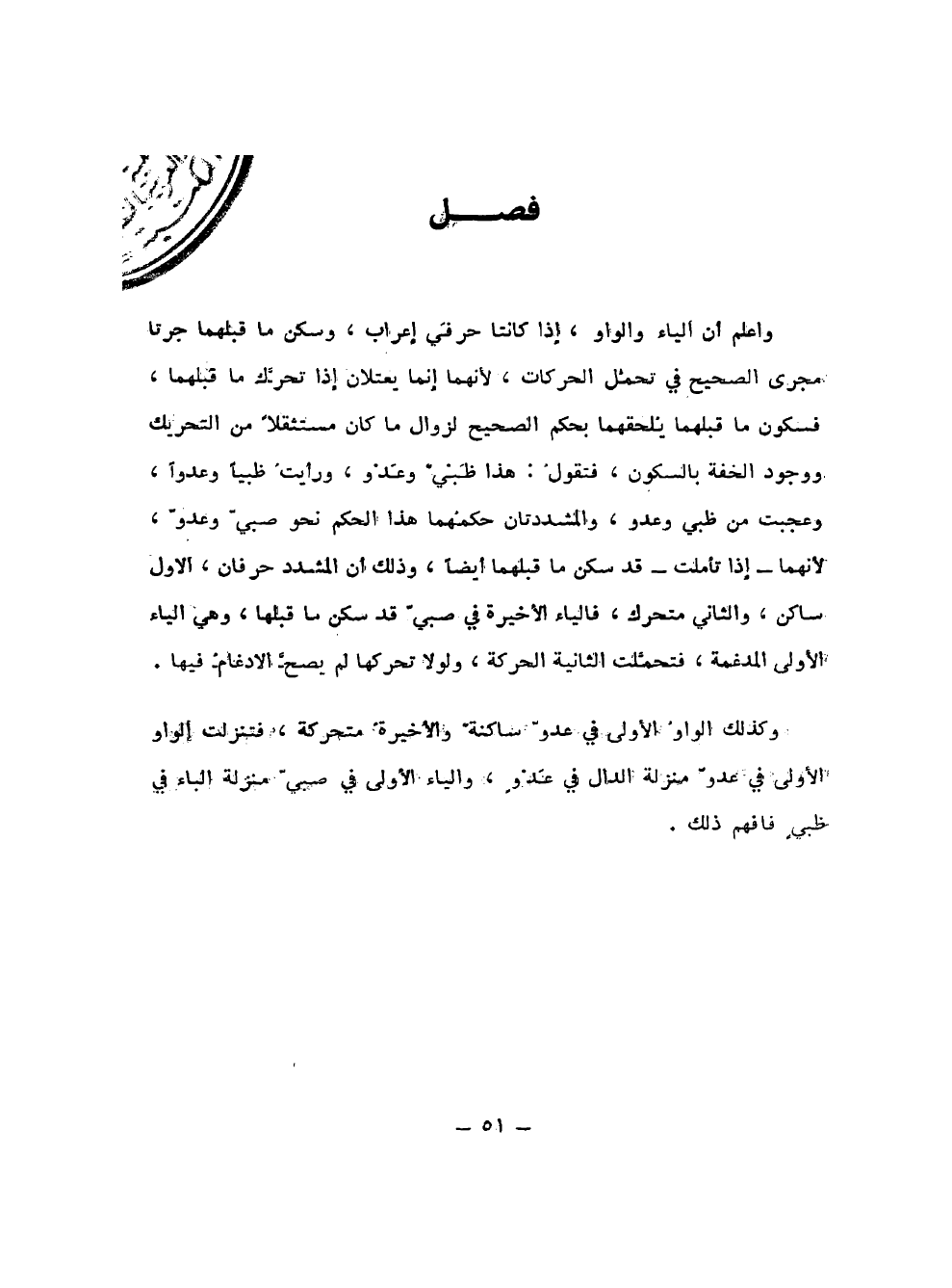 وأعلم أن الياء والواو، إذا كانتا حرفي إعراب، وسكن ما قبلهما جرتا مجرى الصحيح في تحمل الحركات، لأنهما إنما يعتلان إذا تحرك ما قبلهما، فسكون ما قبلهما يلحقهما بحكم الصحيح لزوال ما كان مستثقلاً من التحريك ووجود الخفة بالسكون، فتقول: هذا ظبي وعدو، ورأيت ظبيًا وعدوًا، لأنهما- إذا تأملت- قد سكن ما قبلهما أيضًا، وذلك أن المشدد حرفان، الأول ساكن، والثاني متحرك، فالياء الأخيرة في صبي قد سكن ما قبلها، وهي الياء الأولى المدغمة، فتحملت الثانية الحركة، ولولا تحركها لم يصح الإدغام فيها.