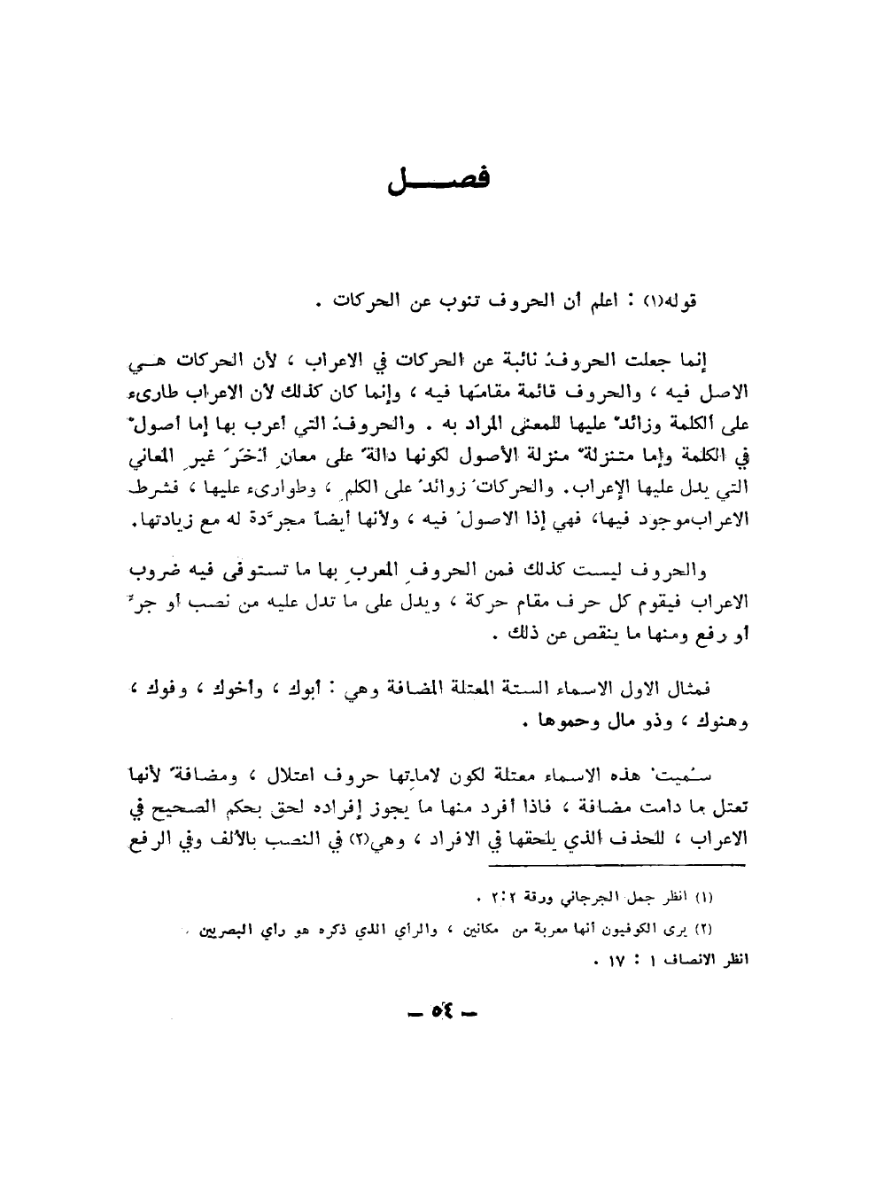 إنما جعلت الحروف- نائبة عن الحركات في الإعراب، لأن الحركات هي الأصل فيه، والحروف قائمة مقامها فيه، وإنما كان كذلك لأن الإعراب طارئ على الكلمة وزائد عليها للمعني المراد به. والحروف التي أعرب بها إما أصول في الكلمة وإما متنزلة منزلة الأصول لكونها دالة على معان آخر غير المعاني التي يدل عليها الإعراب. والحركات زوائد على الكلم، وطوارئ عليها، فشرط الإعراب موجود فيها، فهي إذا الأصول فيه، ولأنها أيضًا مجردة له مع زيادتها.