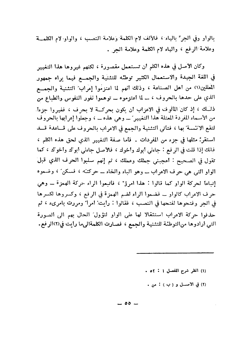 وكان الأصل في هذه الكلم أن تستعمل مقصورة، لكنهم غيروها هذا التغيير في اللغة الجيدة والاستعمال الكثير توطئه للتثنية والجمع فيما يراه جمهور المعللين (¬1) من أهل الصناعة، وذلك أنهم لما اعتزموا إعراب التثنية والجمع الذي على حدها بالحروف، - لما اعتزموه- توهموا نفور النفوس والطباع من ذلك، إذ كان المألوف في الإعراب أن يكون بحركة لا بحرف، فغيروا جزءًا من الأسماء المفردة المعتلة هذا التغيير- وهي هذه-، وجعلوا إعرابها بالحروف لتقع الأتسة بها، فتأتي التثنية والجمع في الإعراب بالحروف على قاعدة قد استقر مثلها في جزء من المفردات. فأما صفة التغيير الذي لحق هذه الكلم، فإنك إذا قلت في الرفع: جاءني أبوك وأخوك، فالأصل جاءني أبوك وأخوك، كما تقول في الصحيح: أعجبني جملك وعملك، ثم إنهم سلبوا الحرف الذي قبل الواو التي هي حرف الإعراب- وهو الباء والخاء- حركته، فسكن، وضموه إتباعًا لحركة الواو كما قالوا: هذا أمرؤ، فأتبعوا الراء حركة الهمزة- وهي حرف الإعراب كالواو- فضموا الراء لضم الهمزة في الرفع، وكسروها لكسرها في الجر وفتحوها لفتحها في النصب، فقالوا: رأيت أمرًا ومررت بامرئ، ثم حذفوا حركة الإعراب استثقالا لها على الواو لتؤول الحال بهم إلى الصورة التي أرادوها من التوطئة للتثنية والجمع، فصارت الكلمة إلى ما رأيت في (¬2) الرفع.