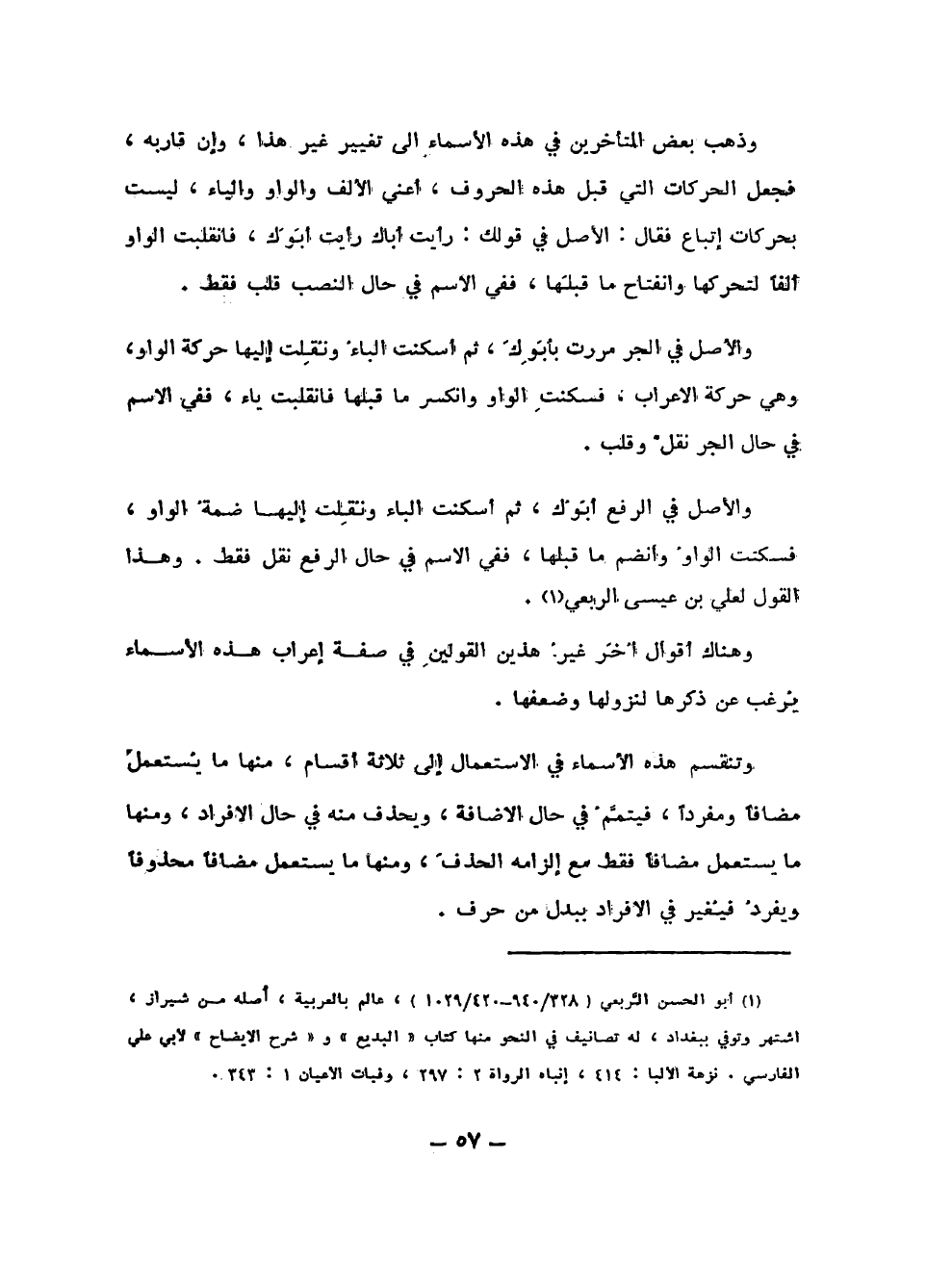 وذهب بعض المتأخرين في هذه الأسماء إلى تغيير غير هذا، وإن قاربه، فجعل الحركات التي قبل هذه الحروف، أعني الألف والواو والياء، ليست بحركات إتباع فقال: الأصل في قولك: رأيت أباك رأيت أبوك، فانقلبت الواو ألفًا لتحركها وانفتاح ما قبلها، ففي الاسم في حال النصب قلب فقط.