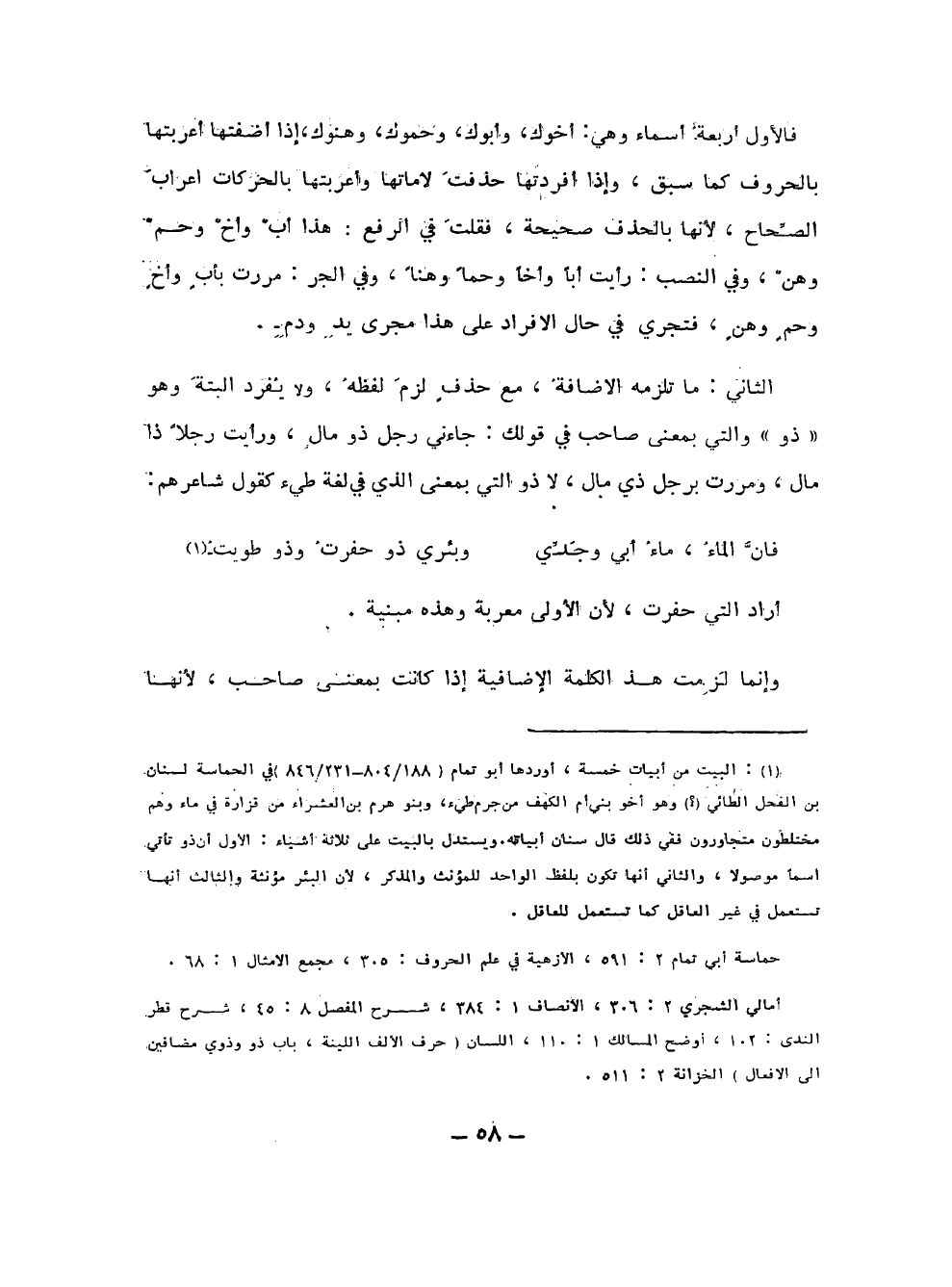 (¬1) البيت من أبيات خمسة، أوردها أبو تمام (188/ 804 - 231/ 846) في الحماسة لسنان بن الفحل الطائي (؟ ) وهو أخو بني أم الكهف من جرم طيء، وبنو هرم بن العشراء من قزارة في ماء وهم مختلطون متجاورون ففي ذلك قال سنان أبياته. ويستدل بالبيت على ثلاثة أشياء: الأول أن ذو تأتي أسمًا موصولًا، والثاني أنها تكون بلفظ الواحد للمؤنث والمذكر، لأن البئر مؤنثة والثالث أنها تستعمل في غير العاقل كما تستعمل للعاقل.