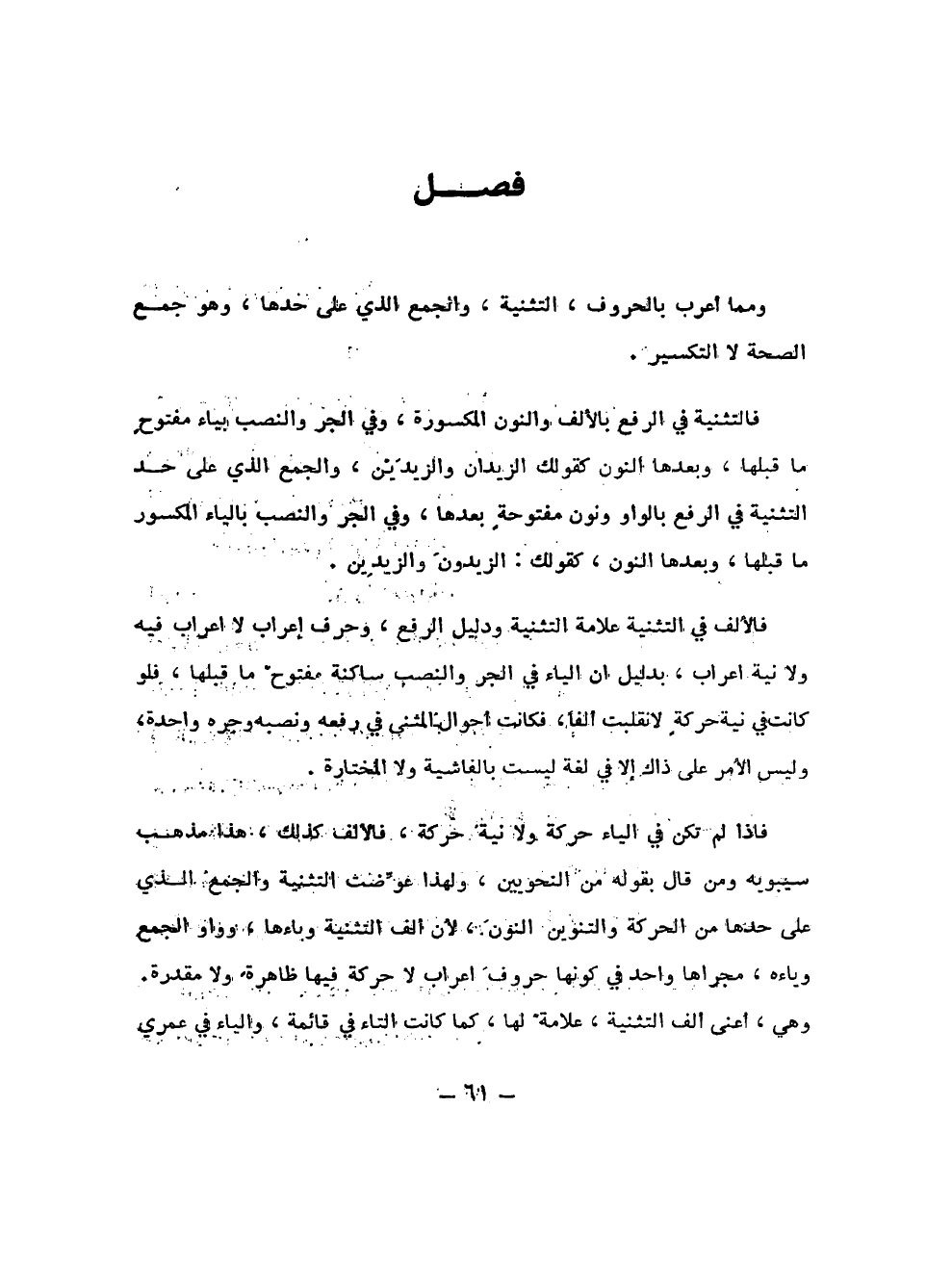 ومما أعرب بالحروف، التثنية، والجمع الذي على حدها، وهو جمع الصحة لا التكسير.