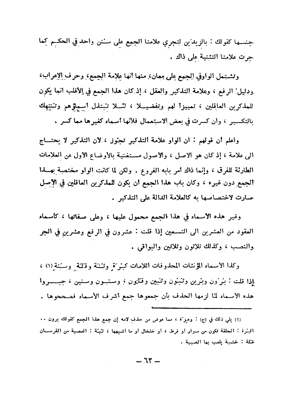 وأعلم أن قولهم: أن الواو علامة التذكير تجوز، لأن التذكير لا يحتاج إلى علامة، إذ كان هو الأصل، والأصول مستغنية بالأوضاع الأول عن العلامات الطارئة للفرق، وإنما ذاك أمر بابه الفروع. ولكن لما كانت الواو مختصة بهذا الجمع دون غيره، وكان باب هذا الجمع أن يكون للمذكرين العاقلين في الأصل صارت لاختصاصها به كالعلامة الدالة على التذكير.