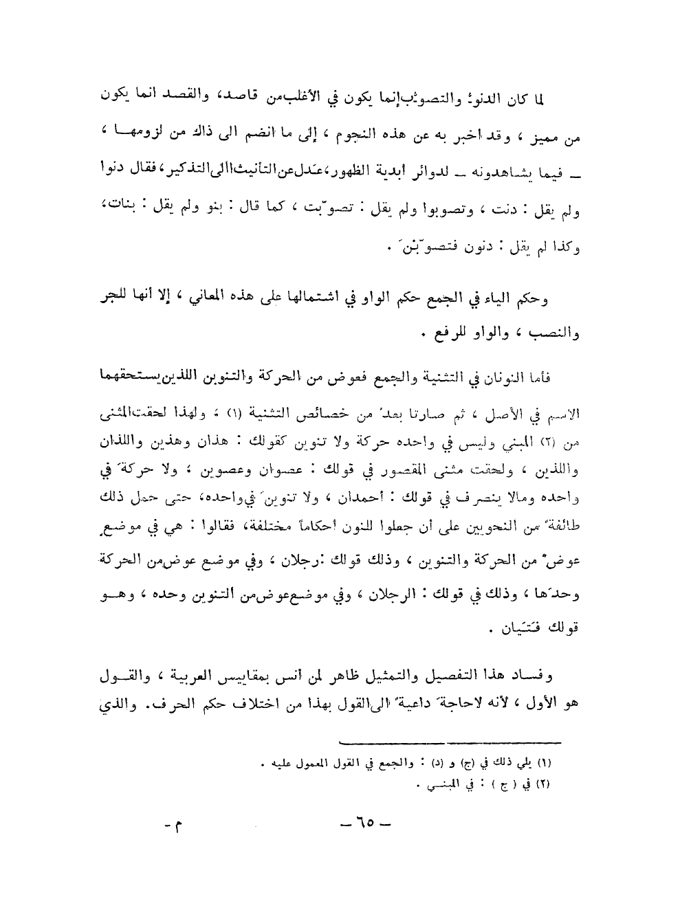 وفساد هذا التفصيل والتمثيل ظاهر لمن أنس بمقاييس العربية، والقول هو الأول، لأنه لا حاجة داعية إلى القول بهذا من اختلاف حكم الحرف. والذي