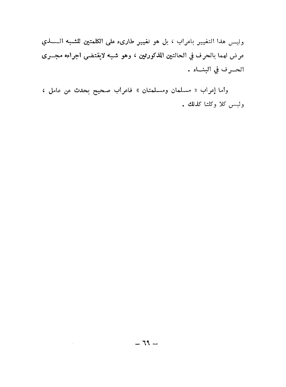 وليس هذا التغيير بإعراب، بل هو تغيير طارئ على الكلمتين للشبه الذي عرض لهما بالحرف في الحالتين المذكورتين، وهو شبه لا يقتضي إجراءه مجرى الحرف في البناء.
