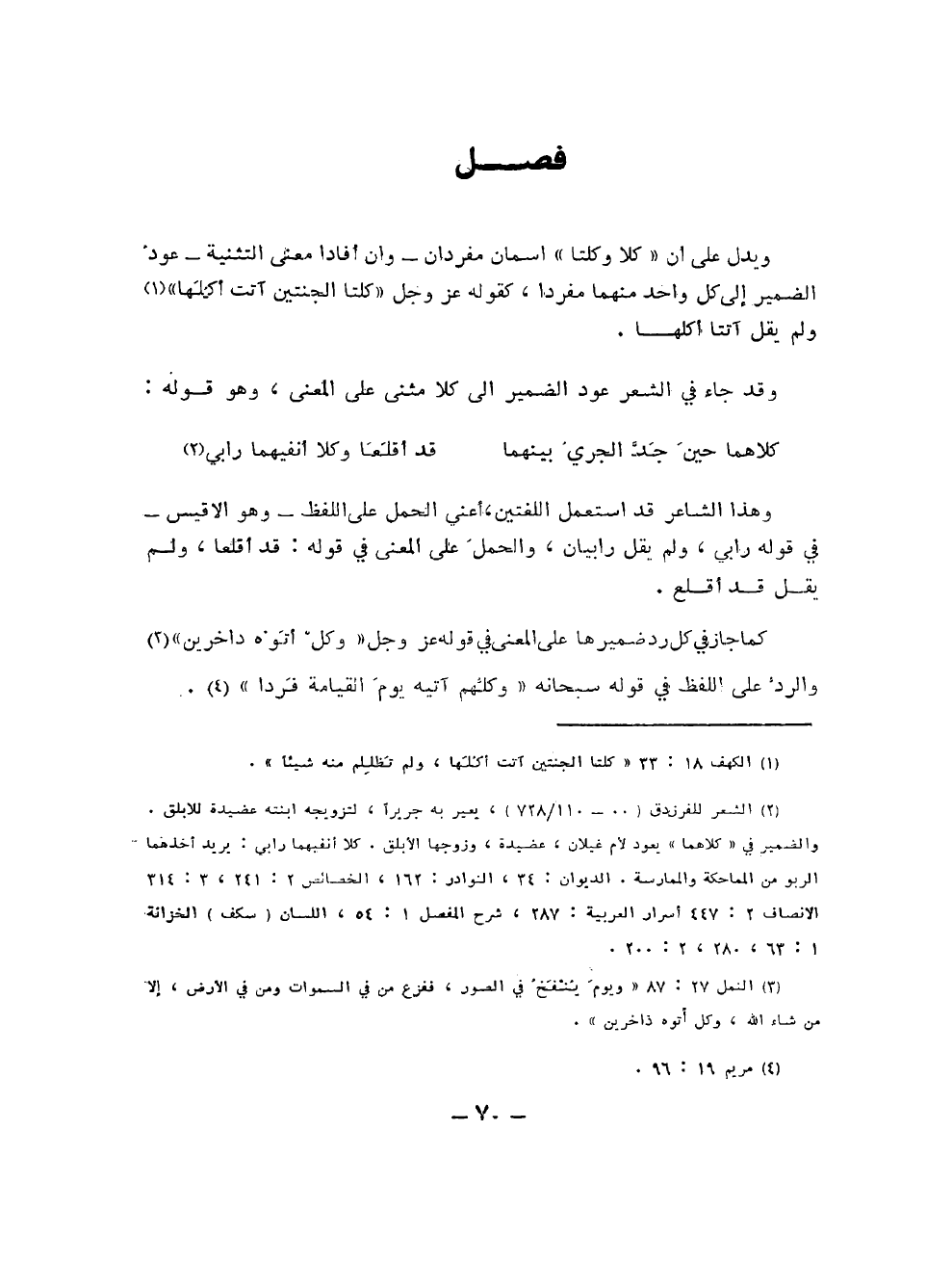 ويدل على أن "كلا وكلتا" اسمان مفردان- وأن أفادا معنى التثنية- عود الضمير إلى كل واحد منهما مفردًا، كقوله عز وجل {كِلْتَا الْجَنَّتَيْنِ آَتَتْ أُكُلَهَا} (¬1) ولم يقل آتتا أكلها.