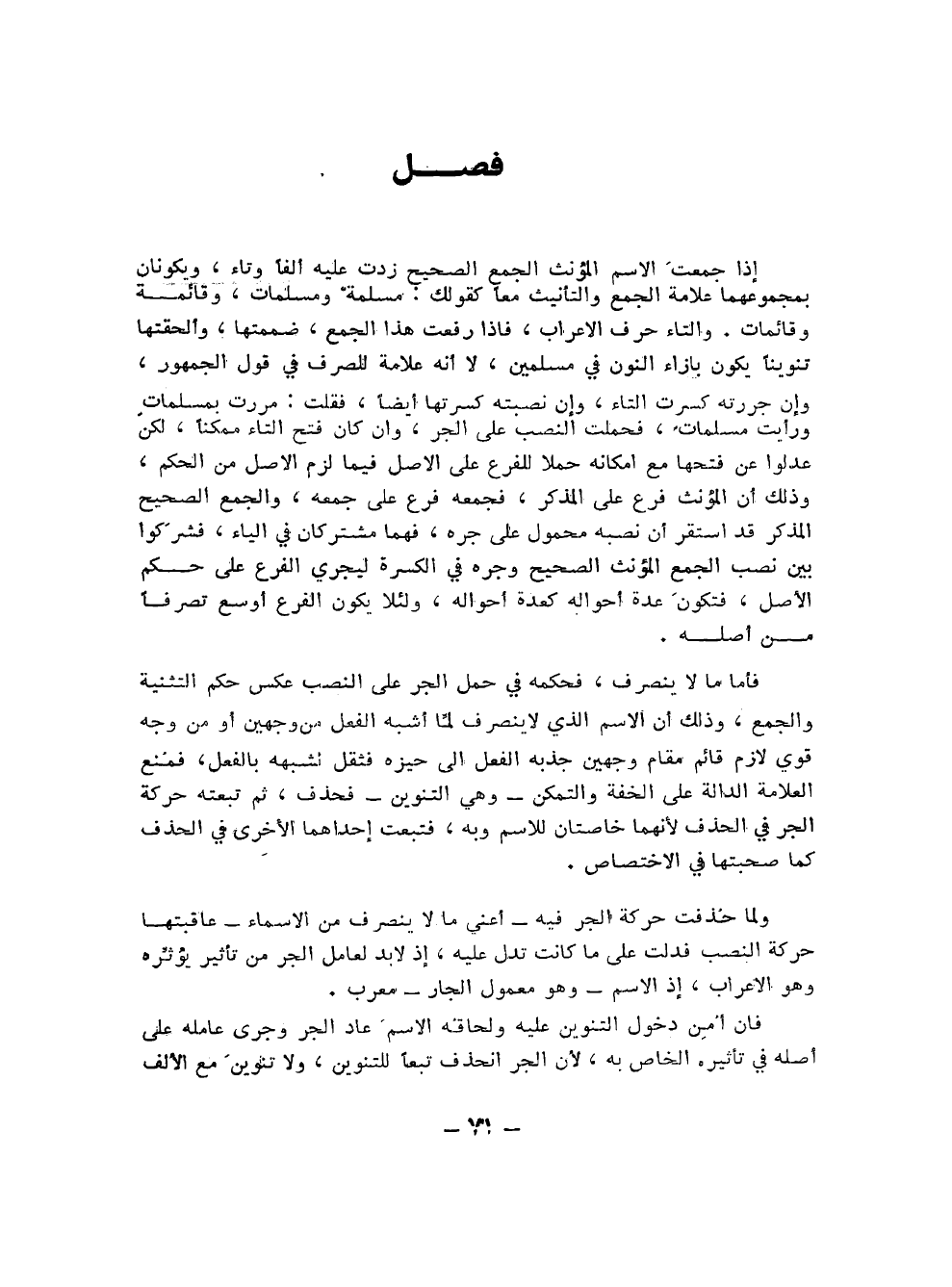 إذا جمعت الاسم المؤنث الجمع الصحيح زدت عليه ألفًا وتاء، ويكونان بمجموعهما علامة الجمع والتأنيث معًا كقولك: مسلمة ومسلمات، وقائمة وقائمات. والتاء حرف الإعراب، فإذا رفعت هذا الجمع، ضممتها، وألحقتها تنوينًا يكون بإزاء النون في مسلمين، لا أنه علامة للصرف في قول الجمهور، وإن جررته كسرت التاء، وإن نصبته كسرتها أيضًا، فقلت: مررت بمسلمات ورأيت مسلمات، فحملت النصب على الجر، وإن كان فتح التاء ممكنًا، لكن عدلوا عن فتحها مع إمكانه حملاً للفرع على الأصل فيما لزم الأصل من الحكم، وذلك أن المؤنث فرع على المذكر، فجمعه فرع على جمعه، والجمع الصحيح المذكر قد استقر أن نصبه محمول على جره، فهما مشتركان في الياء، فشركوا بين نصب الجمع المؤنث الصحيح وجره في الكسرة ليجري الفرع على حكم الأصل، فتكون عدة أحواله كعدة أحواله، ولئلا يكون الفرع أوسع تصرفًا من أصله.