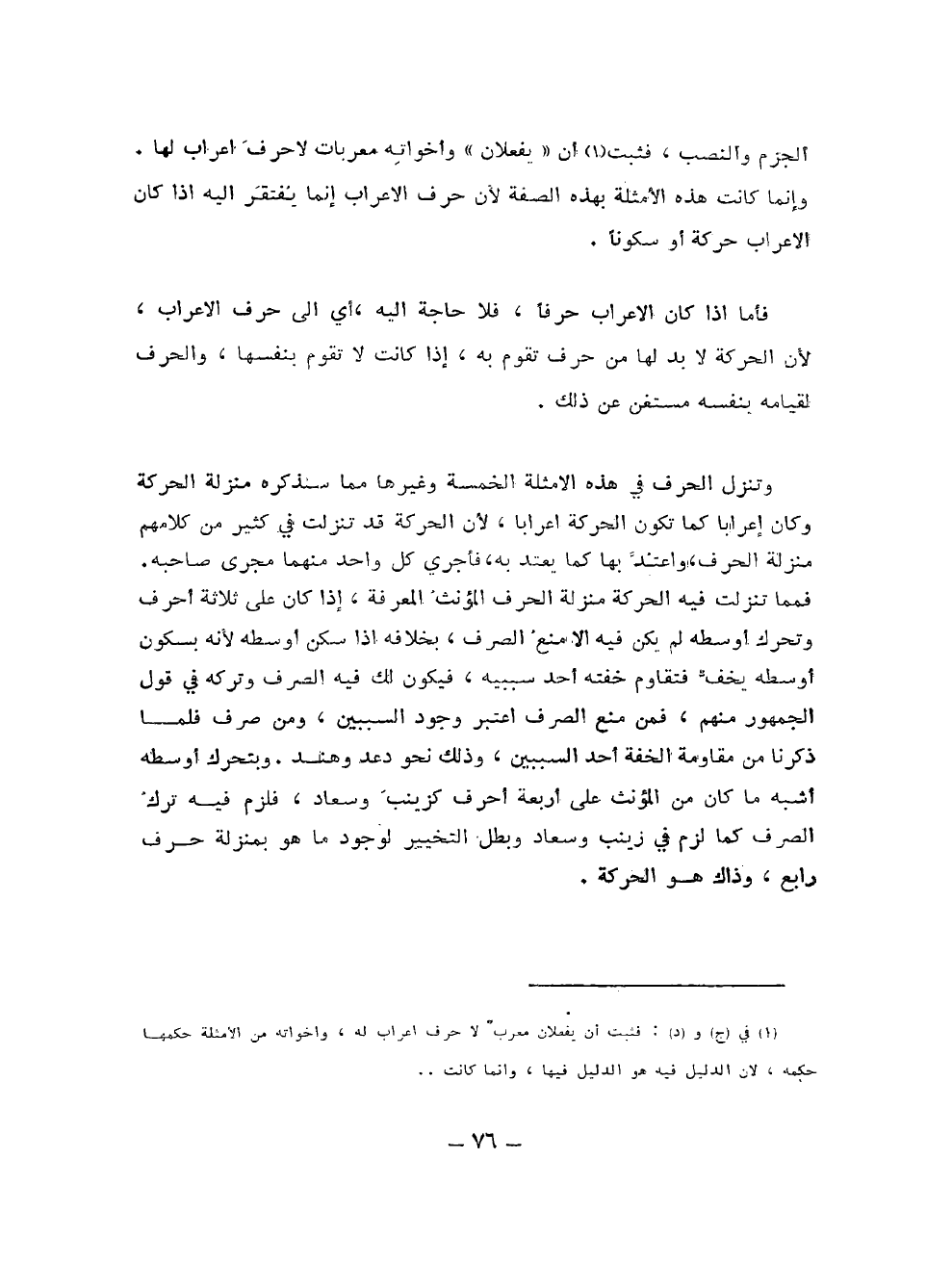وتنزل الحرف في هذه الأمثلة الخمسة وغيرها مما سنذكره منزلة الحركة وكان إعرابًا كما تكون الحركة إعرابًا، لأن الحركة قد تنزلت في كثير من كلامهم منزلة الحرف، واعتد بها كما يعتد به، فأجري كل واحد منهما مجرى صاحبه. فمما تنزلت فيه الحركة منزلة الحرف المؤنث المعرفة، إذا كان على ثلاثة أحرف وتحرك أوسطه لم يكن فيه إلا منع الصرف، بخلافه إذا سكن أوسطه لأنه بسكون أوسطه يخف فتقاوم خفته أحد سببيه، فيكون لك فيه الصرف وتركه في قول الجمهور منهم، فمن منع الصرف اعتبر وجود السبببين، ومن صرف فلما ذكرنا من مقاومة الخفة أحد السببين، وذلك نحو دعد وهند. وبتحرك أوسطه أشبه ما كان من المؤنث على أربعة أحرف كزينب وسعاد، فلزم فيه ترك الصرف كما لزم في زينب وسعاد وبطل التخيير لوجود ما هو بمنزلة حرف رابع، وذاك هو الحركة.