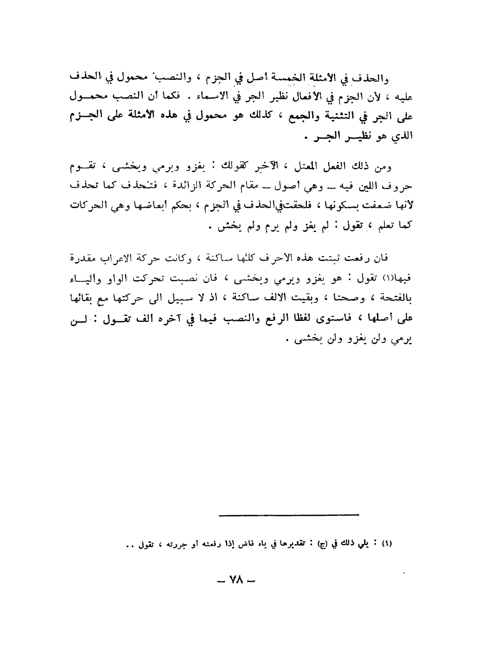 والحذف في الأمثلة الخمسة أصل في الجزم، والنصب محمول في الحذف عليه، لأن الجزم في الأفعال نظير الجر في الأسماء. فكما أن النصب محمول على الجر في التثنية والجمع، كذلك هو محمول في هذه الأمثلة على الجزم الذي هو نظير الجر.
