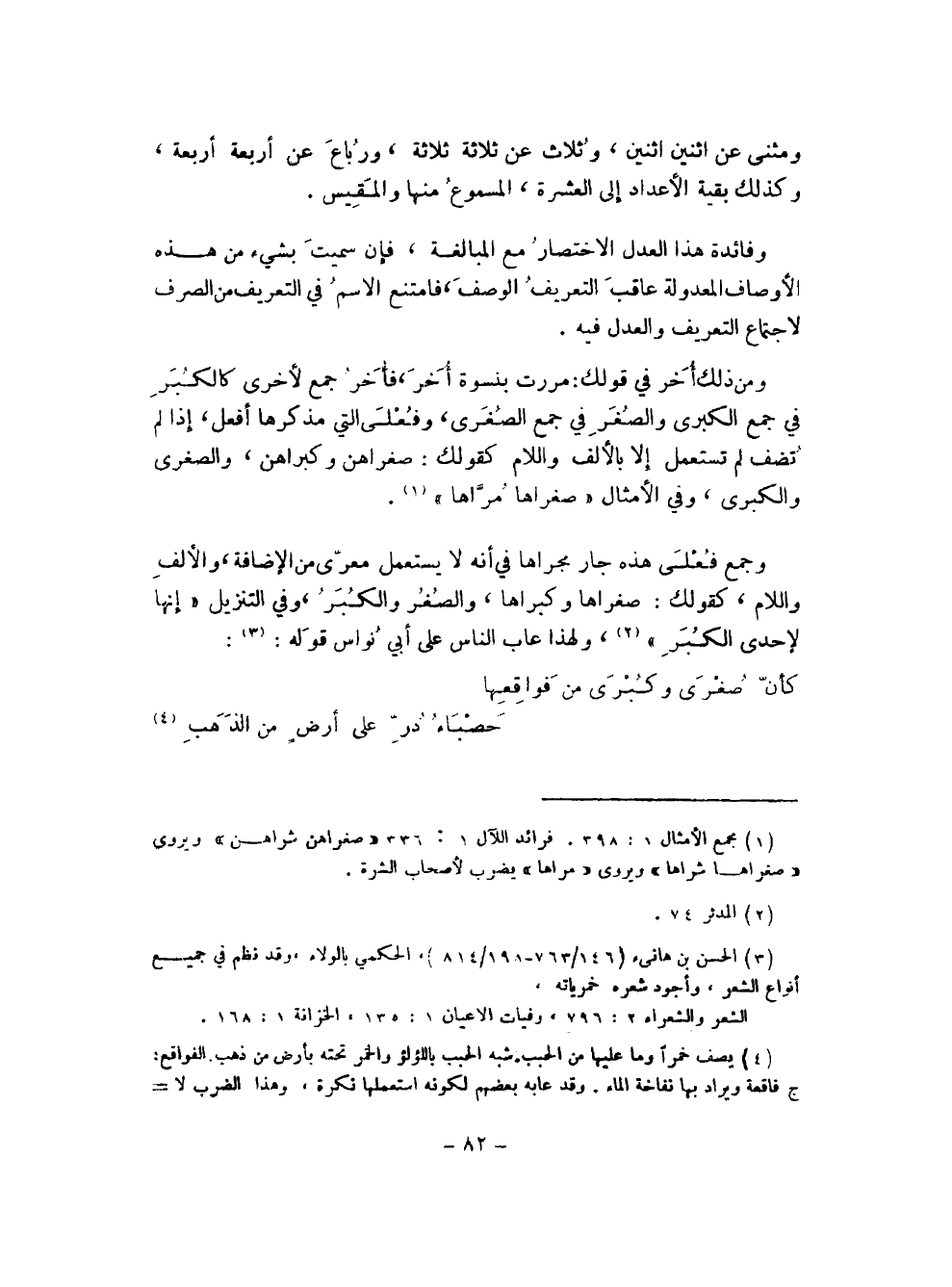 وجمع فعلى هذه جار مجراها في أنه لا يستعمل معرى من الإضافة، والألف واللام، كقولك: صغراها وكبراها، والصغر والكبر، وفي التنزيل {إنها لإحدى الكبر} (¬2)، ولهذا عاب الناس على أبي نواس قوله (¬3):