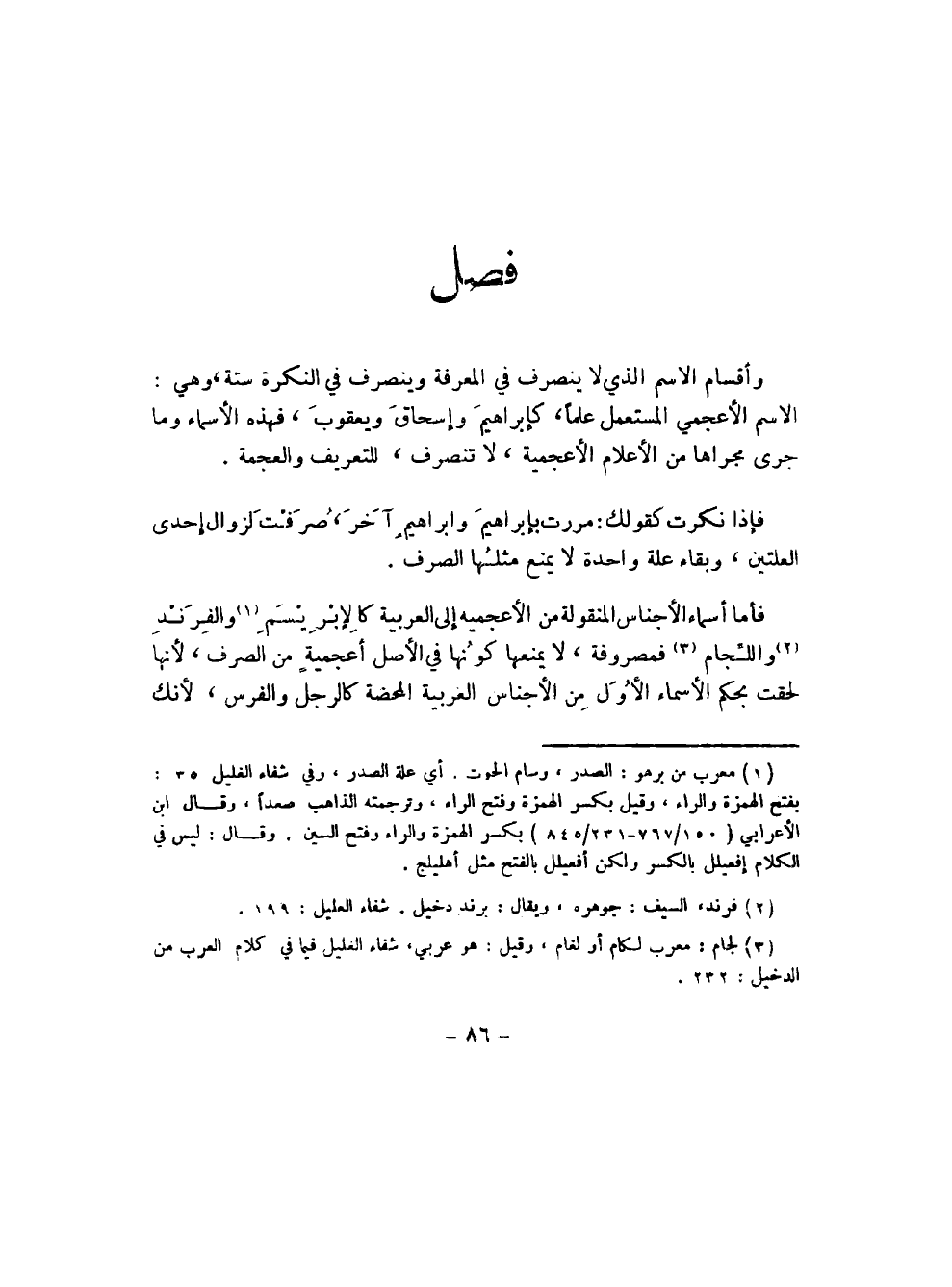 فأما أسماء الأجناس المنقولة من الأعجمية إلى العربية كالإبر يسم (¬1) والفر ند (¬2) واللجام (¬3) فمصروفة، لا يمنعها كونها في الأصل أعجمية من الصرف، لأنها لحقت بحكم الأسماء الأول من الأجناس العربية المحضة كالرجل والفرس، لأنك