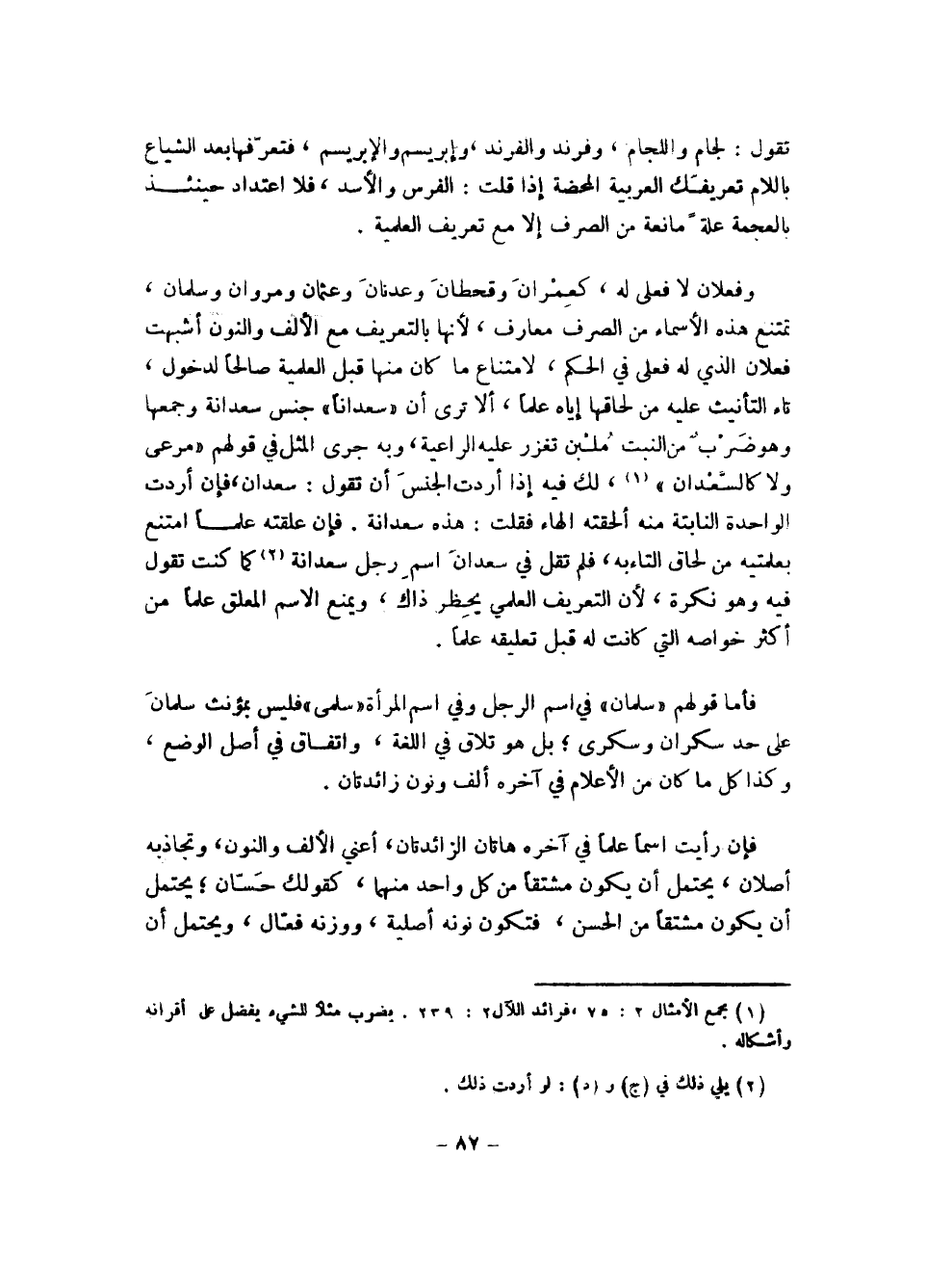 وفعلان لا فعلى له، كعمران وقحطان وعدنان وعثمان ومروان وسلمان، تمتنع هذه الأسماء من الصرف معارف، لأنها بالتعريف مع الألف والنون أشبهت فعلان الذي له فعلى في الحكم، لامتناع ما كان منها قبل العلمية صالحًا لدخول، تاء التأنيث عليه من لحاقها إياه علمًا، ألا ترى أن "سعدانا" جنس سعدانة وجمعها وهو ضرب من النبت ملبن تغزر عليه الراعية، وبه جرى المثل في قولهم "مرعى ولا كالسعدان" (¬1)، لك فيه إذا أردت الجنس أن تقول: سعدان، فإن أردت الواحدة النابتة منه ألحقته الهاء فقلت: هذه سعدانة. فإن علقته علمًا امتنع بعلمتيه من لحاق التاءبه، فلم تقل في سعدان اسم رجل سعدانة (¬2) كما كنت تقول فيه وهو نكرة، لأن التعريف العلمي يحظر ذاك، ويمنع الاسم المعلق علمًا من أكثر خواصه التي كانت له قبل تعليقه علمًا.