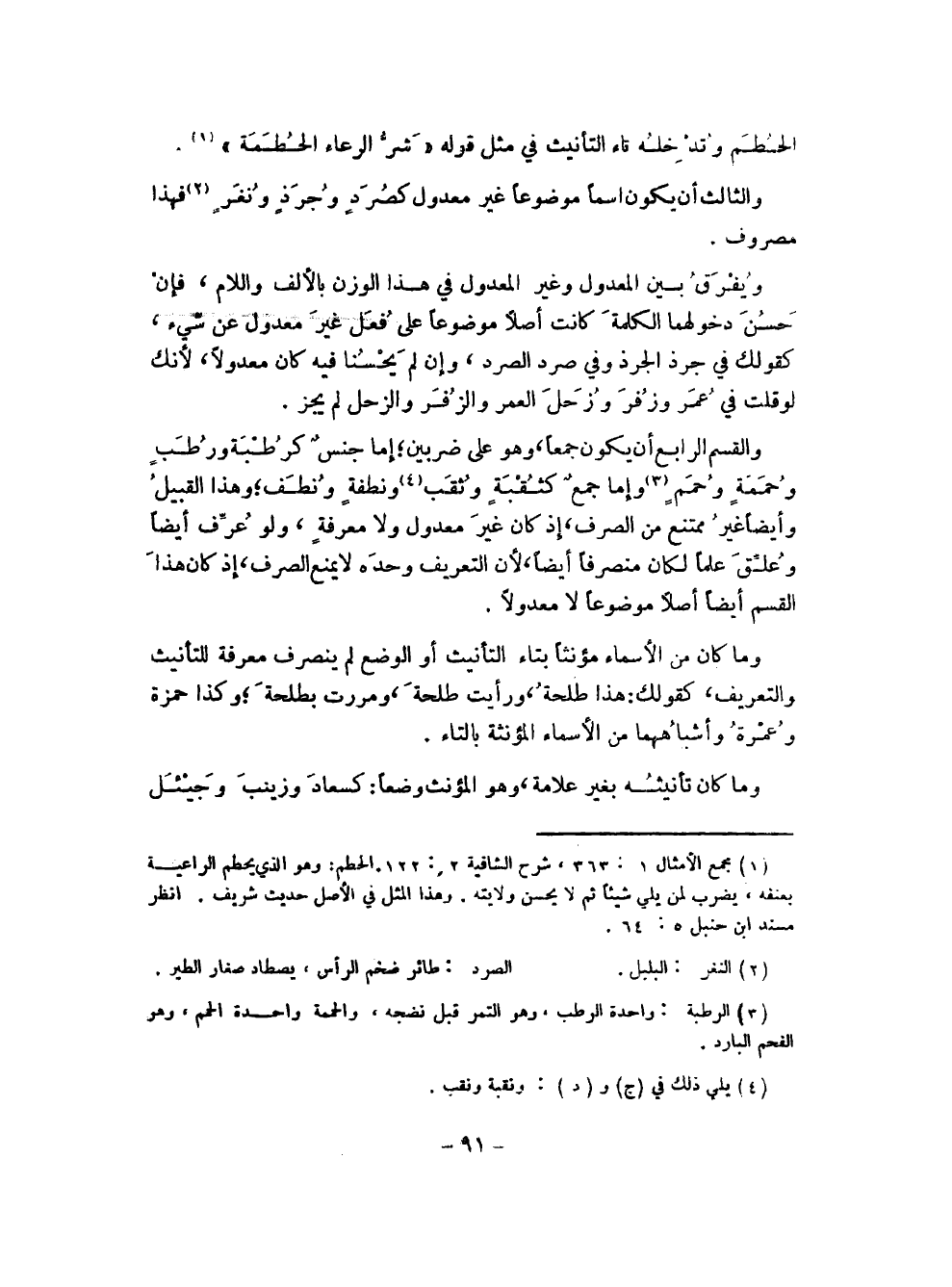 والقسم الرابع أن يكون جمعًا، وهو على ضربين؛ إما جنسٌ كرطبة ورطبٍ وحممةٍ وحممٍ (¬3) وإما جمعٌ كثقبة وثقب (¬4) ونطفةٍ ونطف؛ وهذا القبيل أيضًا غير ممتنع من الصرف، إذ كان غير معدول ولا معرفةٍ، ولو عرف أيضًا وعلق علمًا لكان منصرفًا أيضًا، لأن التعريف وحده لا يمنع الصرف، إذ كان هذا القسم أيضًا أصلاً موضوعًا لا معدولاً.