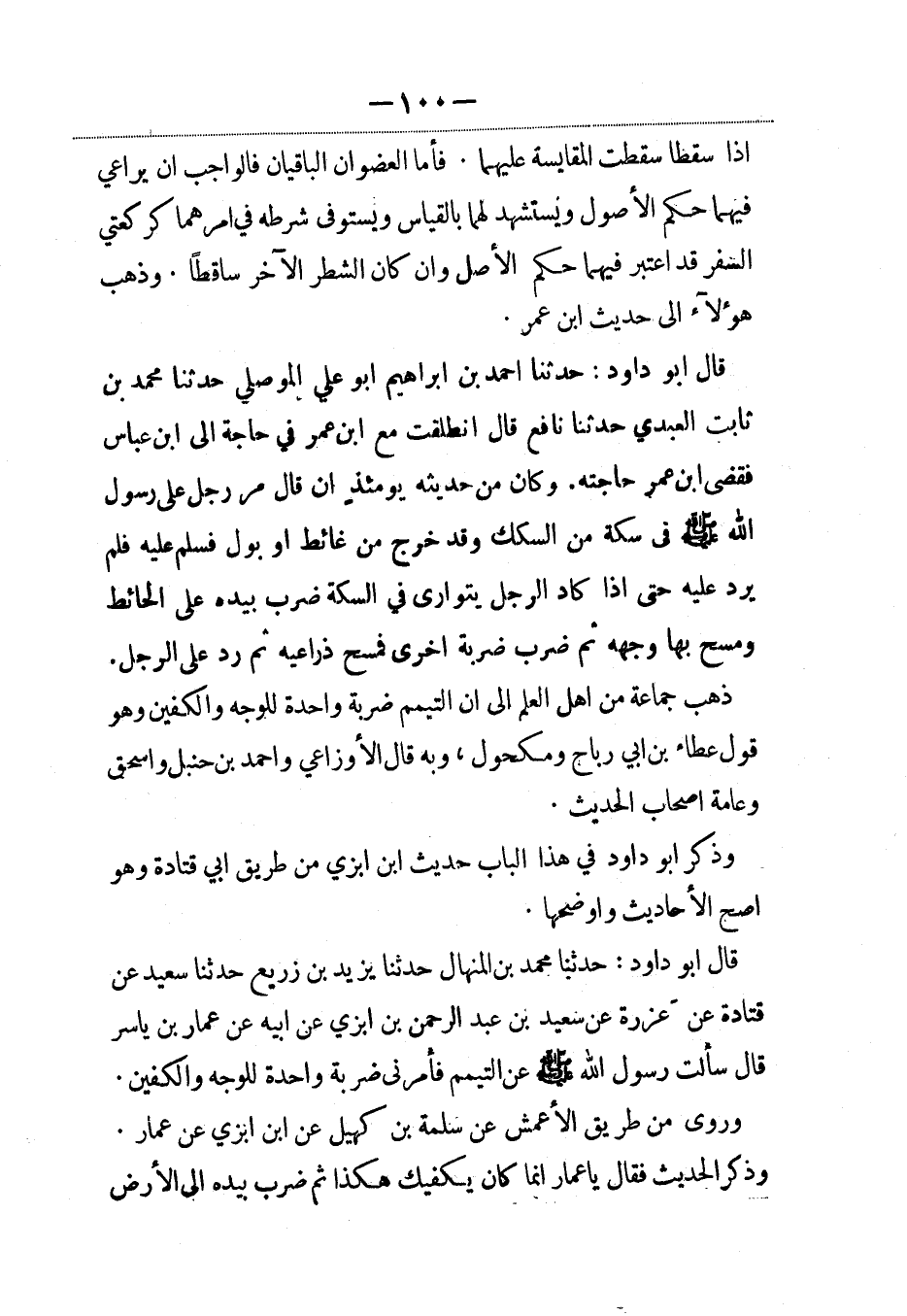 قال أبو داود: حدثنا أحمد بن إبراهيم أبو علي الموصلي حدثنا محمد بن ثابت العبدي حدثنا نافع قال انطلقت مع ابن عمر في حاجة إلى ابن عباس فقضى ابن عمر حاجته. وكان من حديثه يومئذ أن قال مر رجل على رسول الله صلى الله عليه وسلم في سكة من السكك وقد خرج من غائط أو بول فسلم عليه فلم يرد عليه حتى إذا كاد الرجل يتوارى في السكة ضرب بيده على الحائط ومسح بها وجهه ثم ضرب ضربة أخرى فمسح ذراعيه ثم رد على الرجل.