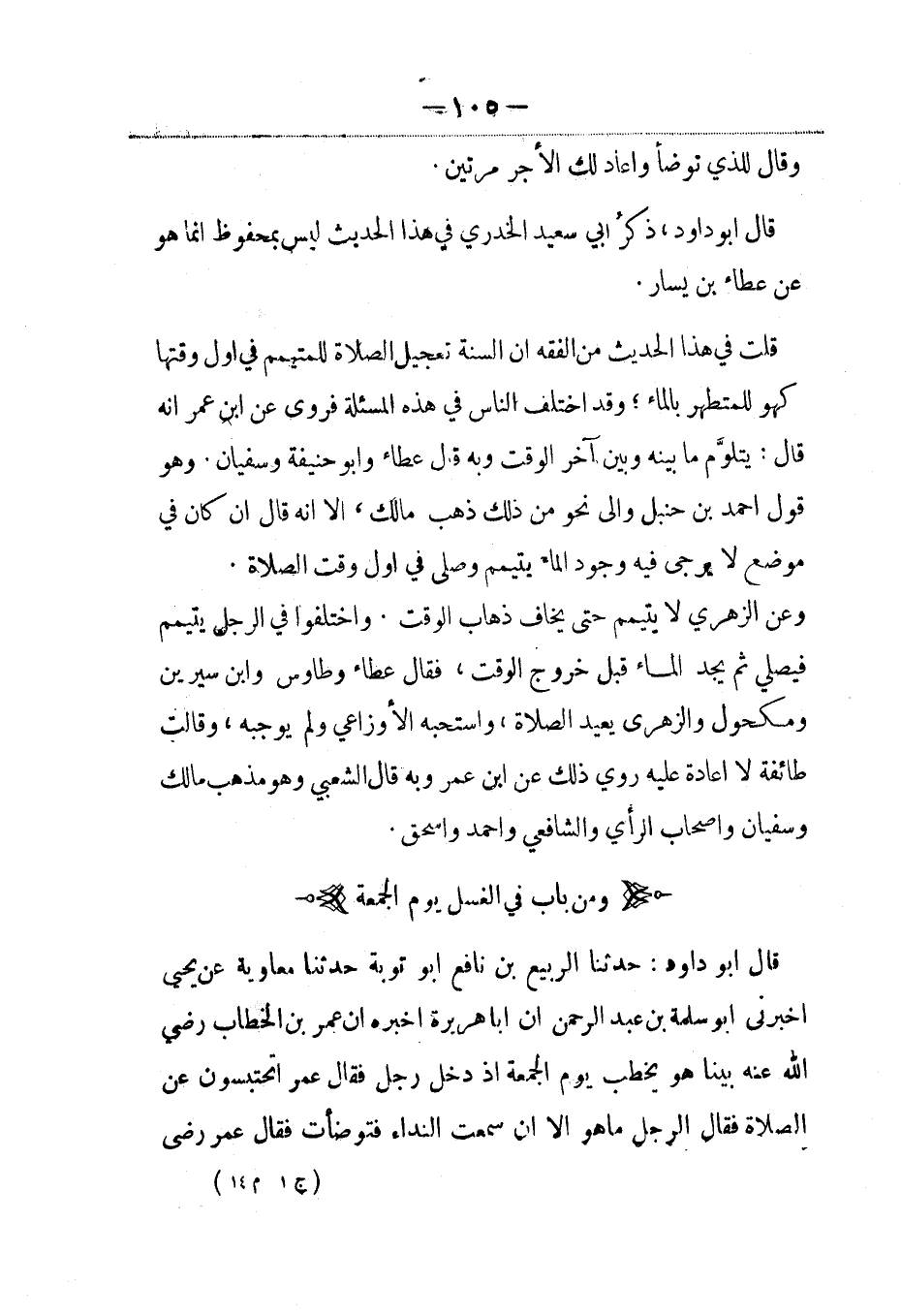 قال أبو داود: حدثنا الربيع بن نافع أبو توبة حدثنا معاوية عن يحيى أخبرني أبو سلمة بن عبد الرحمن أن أبا هريرة أخبره أن عمر بن الخطاب رضي الله عنه بينا هو يخطب يوم الجمعة إذ دخل رجل فقال عمر أتحتبسون عن الصلاة فقال الرجل ما هو إلا أن سمعت النداء فتوضأت فقال عمر رضي