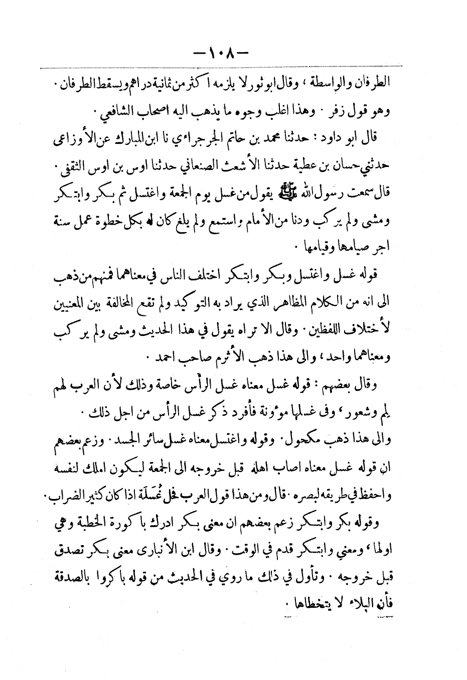 قال أبو داود: حدثنا محمد بن حاتم الجراجرائي نا ابن المبارك عن الأوزاعي حدثني حسان بن عطية حدثنا الأشعث الصنعاني حدثنا أوس بن أوس الثقفي. قال سمعت رسول الله صلى الله عليه وسلم يقول: من غسل يوم الجمعة واغتسل ثم بكر وابتكر ومشى ولم يركب ودنا من الإمام واستمع ولم يلغ كان له بكل خطوة عمل سنة أجر صيامها وقيامها.