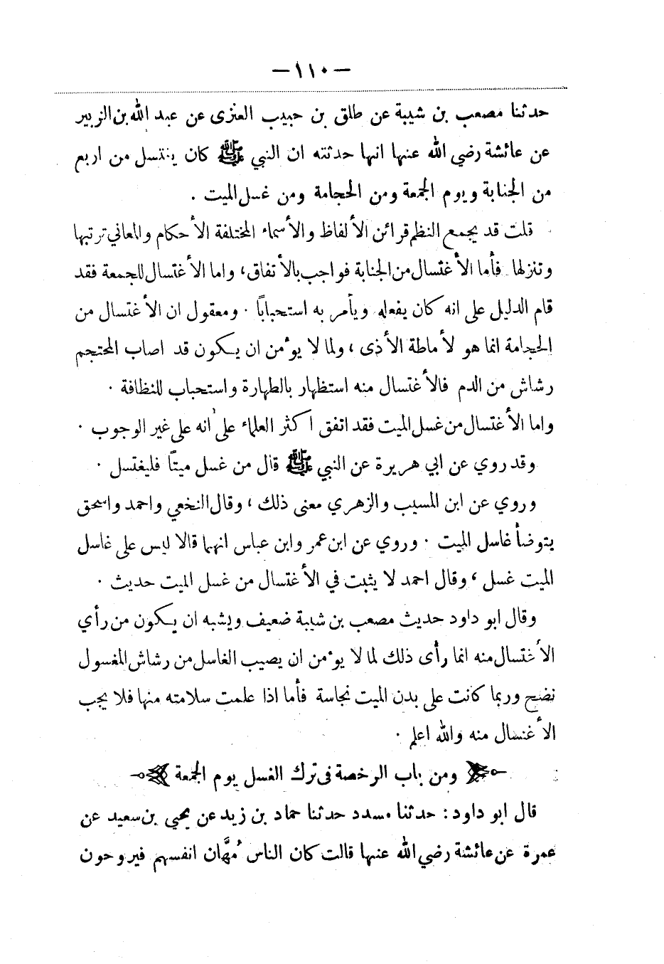 حدثنا مصعب بن شيبة عن طلق بن حبيبب العنزي عن عبد الله بن الزبير عن عائشة رضي الله عنها أنها حدثته أن النبي صلى الله عليه وسلم كان يغتسل من أربع من الجنابة ويوم الجمعة ومن الحجامة ومن غسل الميت.