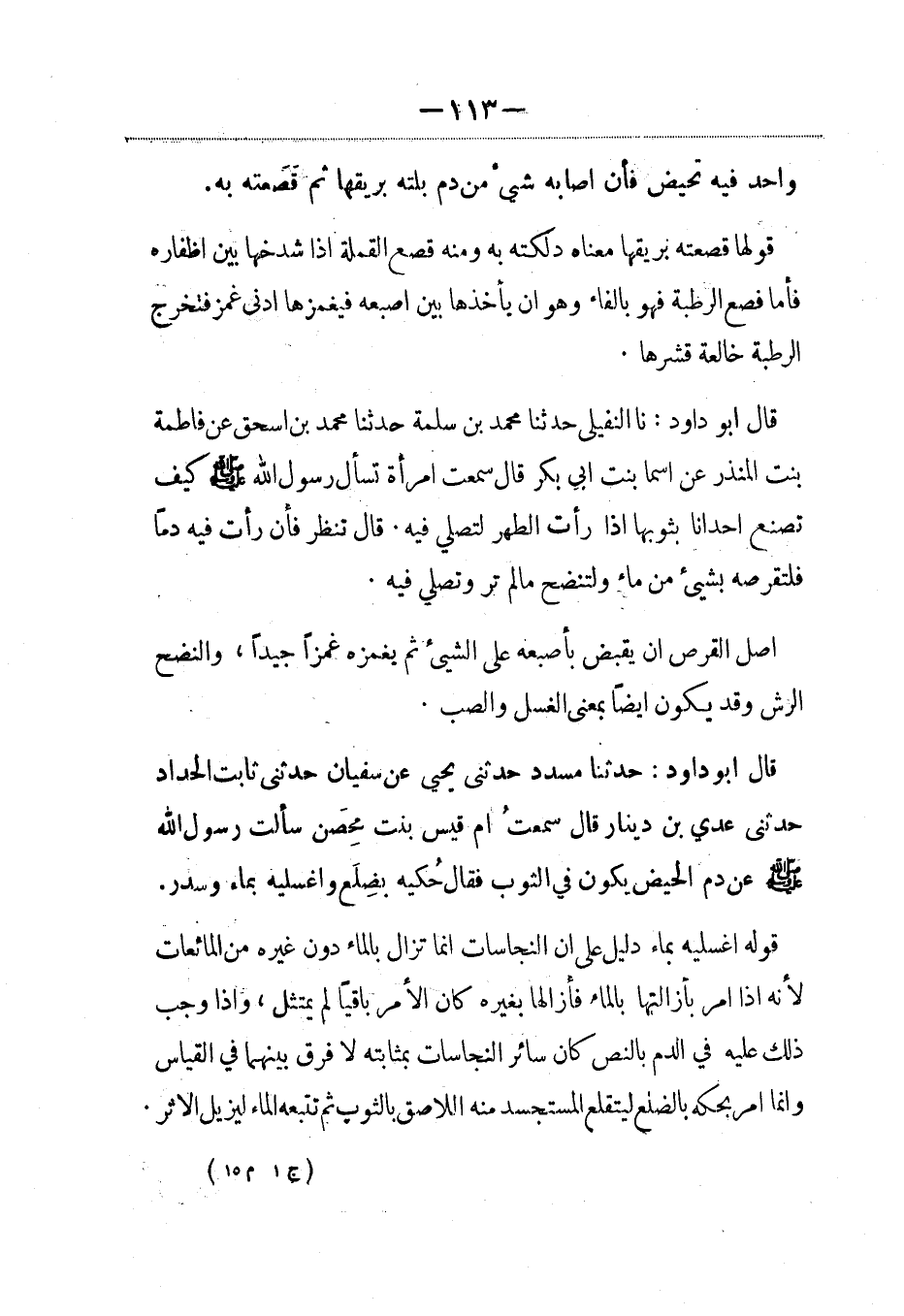 قال أبو داود: نا النفيلي حدثنا محمد بن سلمة حدثنا محمد بن إسحاق عن فاطمة بنت المنذر عن أسماء بنت أبي بكر قال سمعت امرأة تسأل رسول الله صلى الله عليه وسلم كيف تصنع إحدانا بثوبها إذا رأت الطهر لتصلي فيه. قال: تنظر فإن رأت فيه دماً فلتقرصه بشيء من ماء ولتنضح ما لم تر وتصلي فيه.