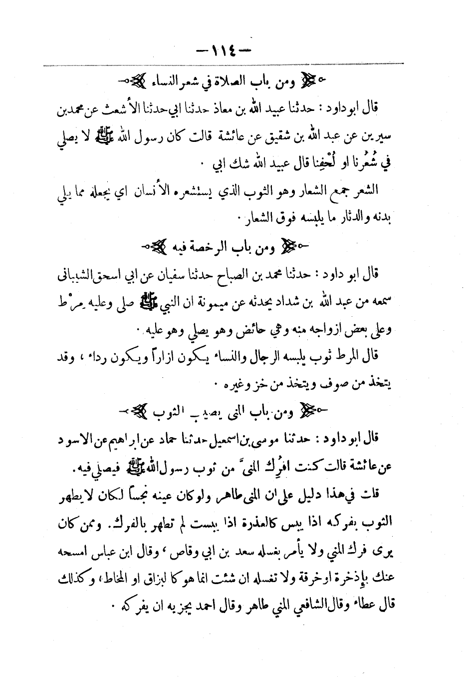قال أبو داود: حدثنا عبيد الله بن معاذ حدثنا أبي حدثنا الأشعث عن محمد بن سيرين عن عبد الله بن شقيق عن عائشة قالت كان رسول الله صلى الله عليه وسلم لا يصلي في شُعُرنا أو لُحفنا قال عبيد الله شك أبي.