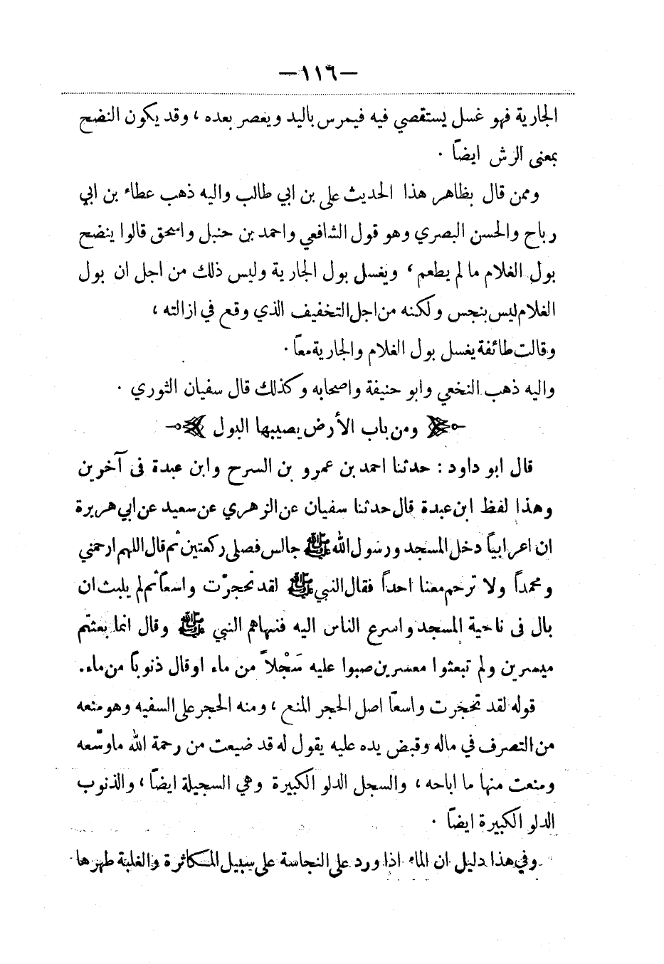 قال أبو داود: حدثنا أحمد بن عمرو بن السرح وابن عبدة في آخرين وهذا لفظ ابن عبدة، قال: حَدَّثنا سفيان عن الزهري عن سعيد، عَن أبي هريرة أن أعرابياً دخل المسجد ورسول الله صلى الله عليه وسلم جالس فصلى ركعتين ثم قال اللهم ارحمني ومحمداً ولا ترحم معنا أحداً فقال النبي صلى الله عليه وسلم لقد تحجرت واسعاً ثم لم يلبث أن بال في ناحية المسجد وأسرع الناس إليه فنهاهم النبي صلى الله عليه وسلم وقال إنما بعثتم ميسرين ولم تبعثوا معسرين صبوا عليه سجلاً من ماء أو قال: ذنوباً من ماء.
