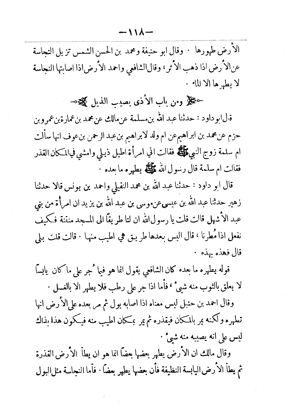 قال أبو داود: حدثنا عبد الله بن مسلمة عن مالك عن محمد بن عمارة بن عمرو بن حزم عن محمد بن إبراهيم عن أم ولد لإبراهيم بن عبد الرحمن بن عوف أنها سألت أم سلمة زوج النبي صلى الله عليه وسلم فقالت إني امرأة أطيل ذيلي وأمشي في المكان القذر فقالت أم سلمة قال رسول الله صلى الله عليه وسلم: يطهره ما بعده.