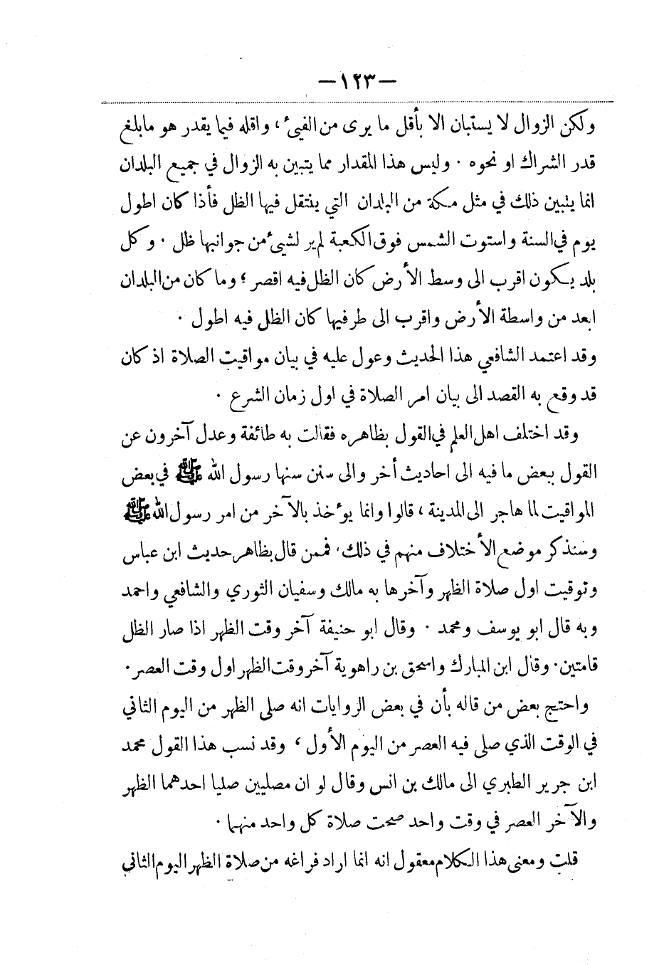 ولكن الزوال لا يستبان إلاّ بأقل ما يرى من الفيء، وأقله فيما يقدر هو ما بلغ قدر الشراك أو نحوه وليس هذا المقدار مما يتبين به الزوال في جميع البلدان إنما يتبين ذلك في مثل مكة من البلدان التي ينتقل فيها الظل فإذا كان أطول يوم في السنة واستوت الشمس فوق الكعبة لم ير لشيء من جوانبها ظل. وكل بلد يكون أقرب إلى وسط الأرض كان الظل فيه أقصر؛ وماكان من البلدان أبعد من واسطة الأرض وأقرب إلى طرفيها كان الظل فيه أطول.
