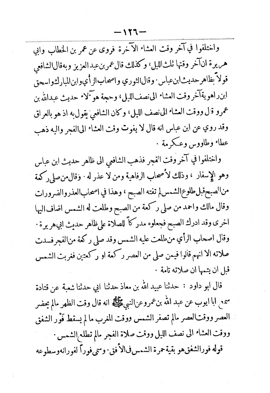واختلفوا في آخر وقت الفجر فذهب الشافعي إلى ظاهر حديث ابن عباس وهو الإسفار، وذلك لأصحاب الرفاهية ومن لا عذر له وقال من صلى ركعة من الصبح قبل طلوع الشمس لم تفته الصبح، وهذا في أصحاب العذر والضرورات وقال مالك وأحمد من صلى ركعة من الصبح وطلعت له الشمس أضاف إليها أخرى وقد أدرك الصبح فجعلوه مدركا للصلاة على ظاهر حديث أبي هريرة. وقال أصحاب الرأي من طلعت عليه الشمس وقد صلى ركعة من الفجر فسدت صلاته إلاّ أنهم قالوا فيمن صلى من العصر ركعة أو ركعتين فغربت الشمس قبل أن يتمها إن صلاته تامة.