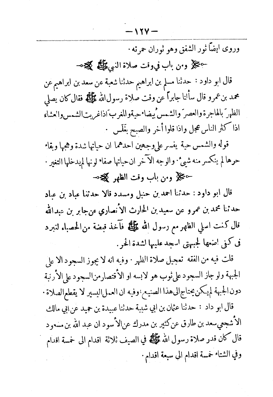 قال أبو داود: حدثنا عثمان بن أبي شيبة حدثنا عبيدة بن حميد، عَن أبي مالك الأشجعي سعد بن طارق عن كثير بن مدرك عن الأسود أن عبد الله بن مسعود قال كان قدر صلاة رسول الله صلى الله عليه وسلم في الصيف ثلاثة أقدام إلى خمسة أقدام وفي الشتاء خمسة أقدام إلى سبعة أقدام.