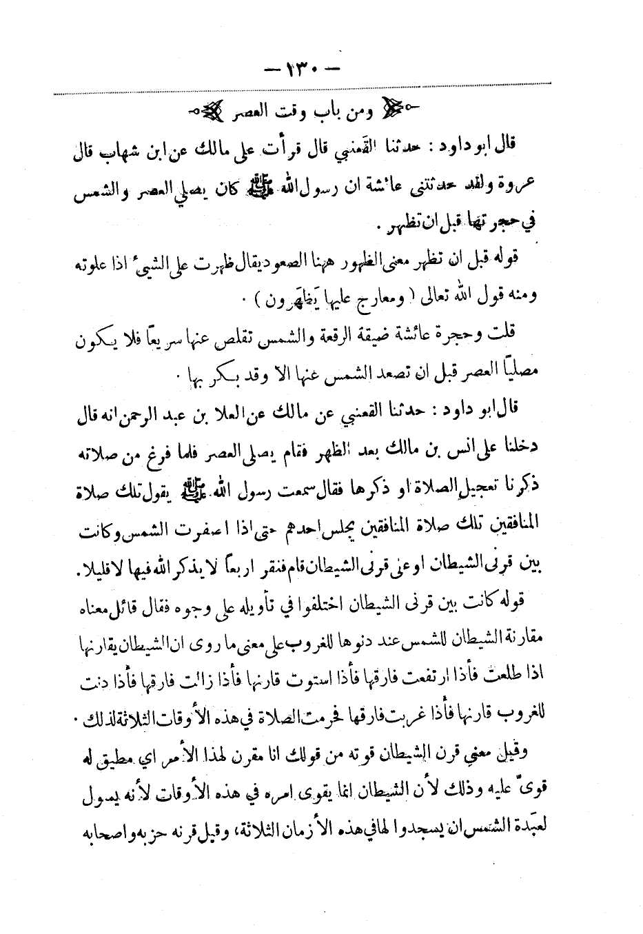 قال أبو داود: حدثنا القعنبي قال قرأت على مالك عن ابن شهاب قال عروة ولقد حدثتني عائشة أن رسول الله صلى الله عليه وسلم كان يصلي العصر والشمس في حجرتها قبل أن تظهر.