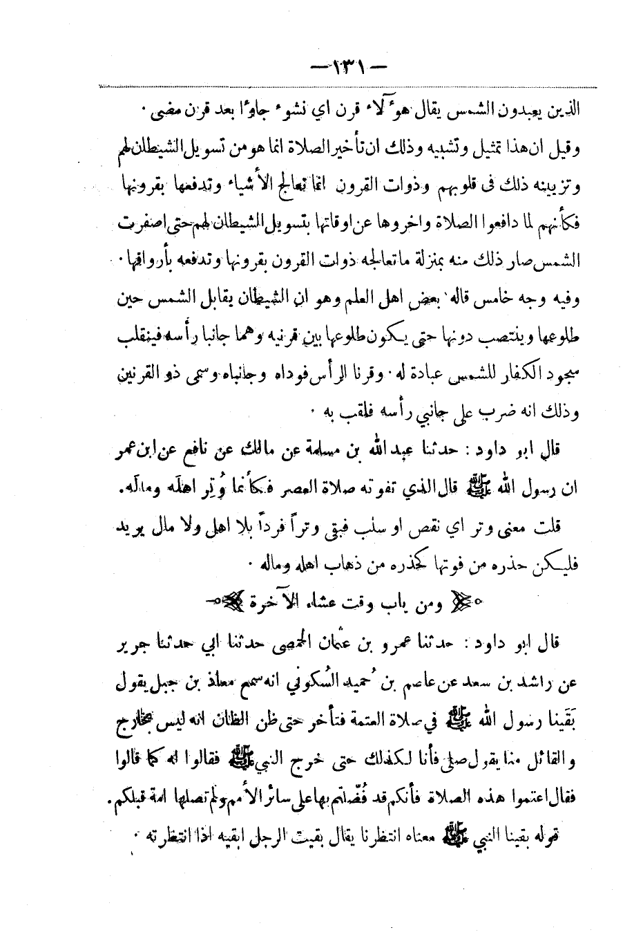 قال أبو داود: حدثنا عبد الله بن مسلمة عن مالك عن نافع عن ابن عمر أن رسول الله صلى الله عليه وسلم قال: الذي تفوته صلاة العصر فكأنما وتر أهله وماله.