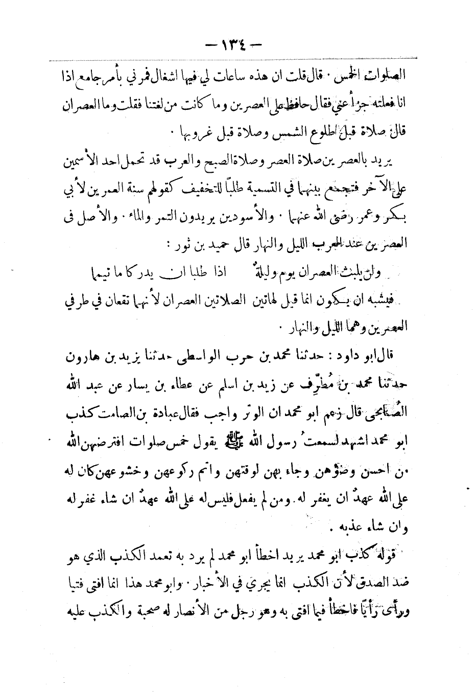 قال أبو داود: حدثنا محمد بن حرب الواسطي حدثنا يزيد بن هارون حدثنا محمد بن مطرف عن زيد بن أسلم عن عطاء بن يسار عن عبد الله الصنابحى قال زعم أبو محمد أن الوتر واجب فقال عيادة بن الصامت كذب أبو محمد أشهد لسمعت رسول الله صلى الله عليه وسلم يقول: خمس صلوات افترضهن الله من أحسن وضوءهن وجاء بهن لوقتهن وأتم ركوعهن وخشوعهن كان له على الله عهدٌ أن يغفر له. ومن لم يفعل فليس له على الله عهد إن شاء غفر له وإن شاء عذبه.